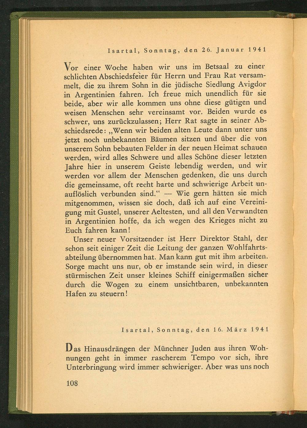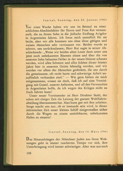 Vor einer Woche haben wir uns im Betsaal zu einer schlichten Abschiedsfeier für Herrn und Frau Rat versammelt, die zu ihrem Sohn in die jüdische Siedlung Avigdor in Argentinien fahren. Ich freue mich unendlich für sie beide, aber wir alle kommen uns ohne diese gütigen und weisen Menschen sehr vereinsamt vor. Beiden wurde es schwer, uns zurückzulassen; Herr Rat sagte in seiner Abschiedsrede: ,, Wenn wir beiden alten Leute dann unter uns jetzt noch unbekannten Bäumen sitzen und über die von unserem Sohn bebauten Felder in der neuen Heimat schauen werden, wird alles Schwere und alles Schöne dieser letzten Jahre hier in unserem Geiste lebendig werden, und wir werden vor allem der Menschen gedenken, die uns durch die gemeinsame, oft recht harte und schwierige Arbeit unauflöslich verbunden sind." Wie gern hätten sie mich mitgenommen, wissen sie doch, daß ich auf eine Vereinigung mit Gustel, unserer Aeltesten, und all den Verwandten in Argentinien hoffe, da ich wegen des Krieges nicht zu Euch fahren kann!
