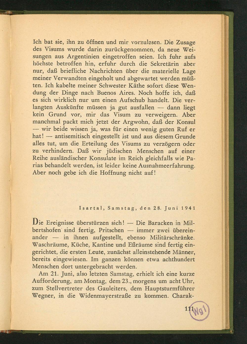 Ich bat sie, ihn zu öffnen und mir vorzulesen. Die Zusage des Visums wurde darin zurückgenommen, da neue Weisungen aus Argentinien eingetroffen seien. Ich fuhr aufs höchste betroffen hin, erfuhr durch die Sekretärin aber nur, daß briefliche Nachrichten über die materielle Lage meiner Verwandten eingeholt und abgewartet werden müßten. Ich kabelte meiner Schwester Käthe sofort diese Wendung der Dinge nach Buenos Aires . Noch hoffe ich, daß es sich wirklich nur um einen Aufschub handelt. Die verlangten Auskünfte müssen ja gut ausfallen- dann liegt kein Grund vor, mir das Visum zu verweigern. Aber manchmal packt mich jetzt der Argwohn, daß der Konsul -wir beide wissen ja, was für einen wenig guten Ruf er hat! antisemitisch eingestellt ist und aus diesem Grunde alles tut, um die Erteilung des Visums zu verzögern oder zu verhindern. Daß wir jüdischen Menschen auf einer Reihe ausländischer Konsulate im Reich gleichfalls wie Parias behandelt werden, ist leider keine Ausnahmeerfahrung. Aber noch gebe ich die Hoffnung nicht auf!