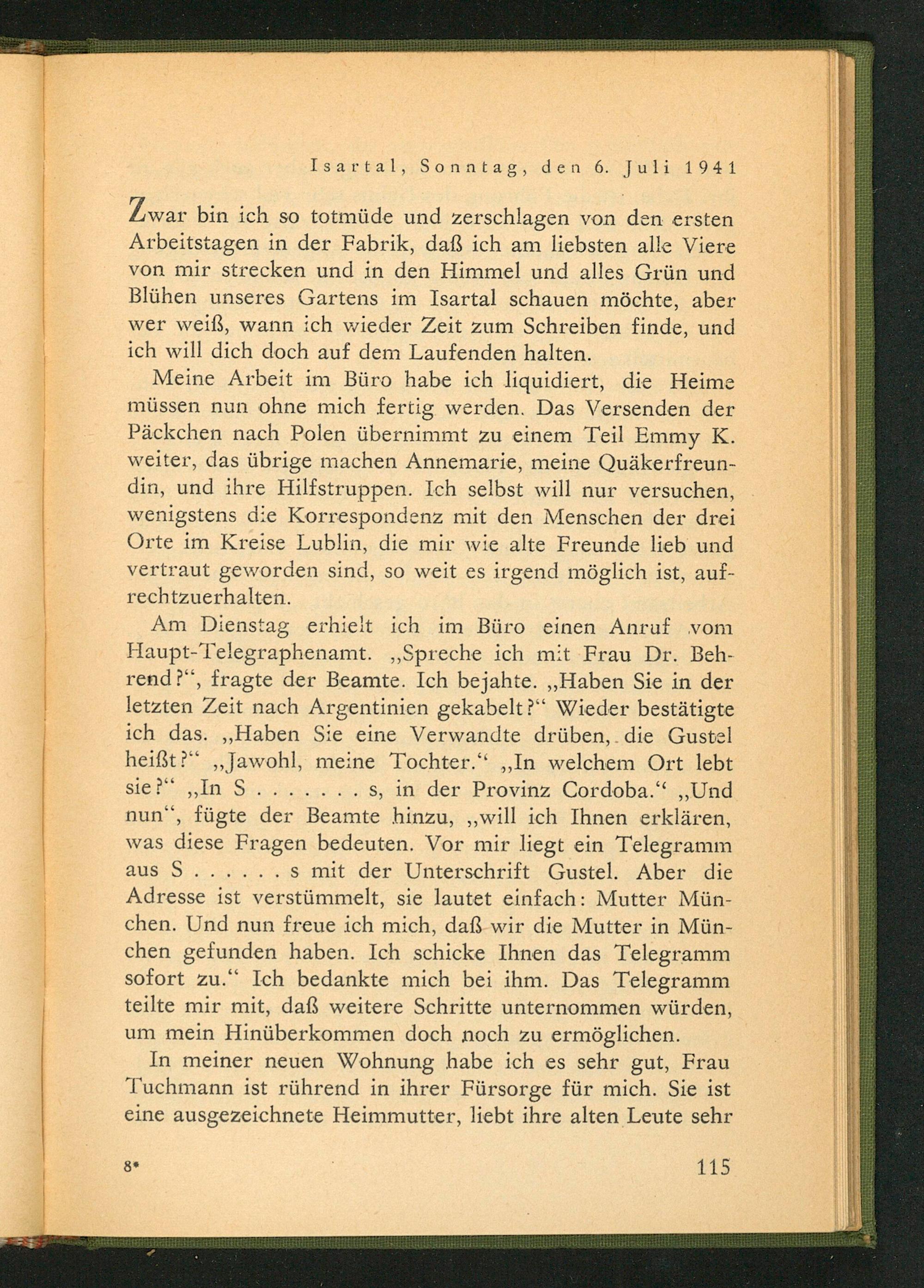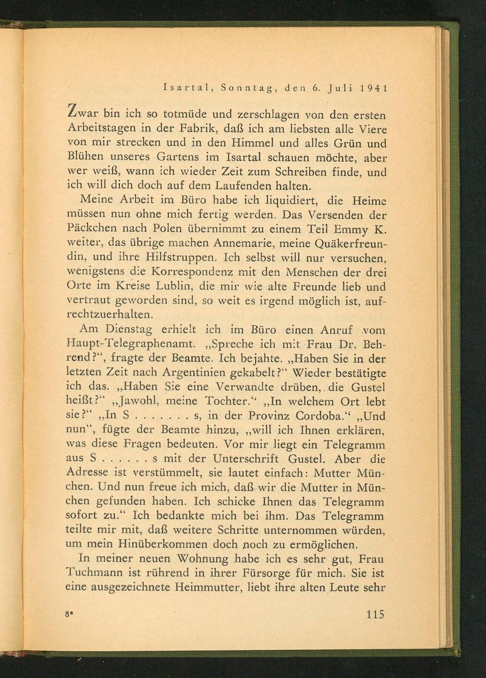 Am Dienstag erhielt ich im Büro einen Anruf vom Haupt- Telegraphenamt. ,, Spreche ich mit Frau Dr. Behrend?", fragte der Beamte. Ich bejahte. ,, Haben Sie in der letzten Zeit nach Argentinien gekabelt?" Wieder bestätigte ich das. ,, Haben Sie eine Verwandte drüben, die Gustel heißt?" ,, Jawohl, meine Tochter." ,, In welchem Ort lebt sie?" ,, In S. s, in der Provinz Cordoba ." ,, Und nun", fügte der Beamte hinzu ,,, will ich Ihnen erklären, was diese Fragen bedeuten. Vor mir liegt ein Telegramm aus S.... s mit der Unterschrift Gustel. Aber die Adresse ist verstümmelt, sie lautet einfach: Mutter München. Und nun freue ich mich, daß wir die Mutter in München gefunden haben. Ich schicke Ihnen das Telegramm sofort zu." Ich bedankte mich bei ihm. Das Telegramm teilte mir mit, daß weitere Schritte unternommen würden, um mein Hinüberkommen doch noch zu ermöglichen.