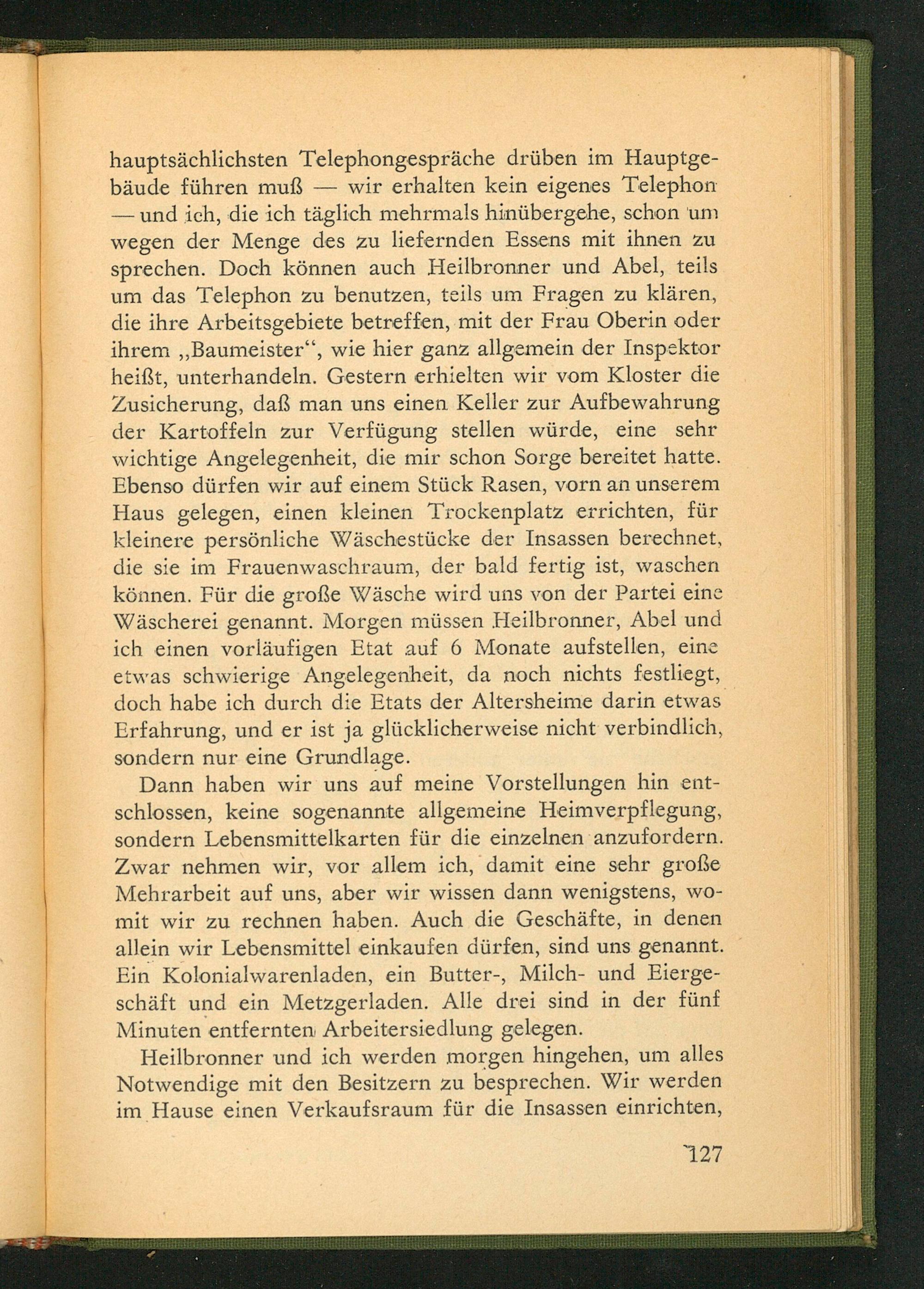 hauptsächlichsten Telephongespräche drüben im Hauptgebäude führen muß wir erhalten kein eigenes Telephon - und ich, die ich täglich mehrmals hinübergehe, schon um wegen der Menge des zu liefernden Essens mit ihnen zu sprechen. Doch können auch Heilbronner und Abel, teils um das Telephon zu benutzen, teils um Fragen zu klären, die ihre Arbeitsgebiete betreffen, mit der Frau Oberin oder ihrem ,, Baumeister ", wie hier ganz allgemein der Inspektor heißt, unterhandeln. Gestern erhielten wir vom Kloster die Zusicherung, daß man uns einen Keller zur Aufbewahrung der Kartoffeln zur Verfügung stellen würde, eine sehr wichtige Angelegenheit, die mir schon Sorge bereitet hatte. Ebenso dürfen wir auf einem Stück Rasen, vorn an unserem Haus gelegen, einen kleinen Trockenplatz errichten, für kleinere persönliche Wäschestücke der Insassen berechnet, die sie im Frauenwaschraum, der bald fertig ist, waschen können. Für die große Wäsche wird uns von der Partei eine Wäscherei genannt. Morgen müssen Heilbronner, Abel und ich einen vorläufigen Etat auf 6 Monate aufstellen, eine etwas schwierige Angelegenheit, da noch nichts festliegt, doch habe ich durch die Etats der Altersheime darin etwas Erfahrung, und er ist ja glücklicherweise nicht verbindlich, sondern nur eine Grundlage.