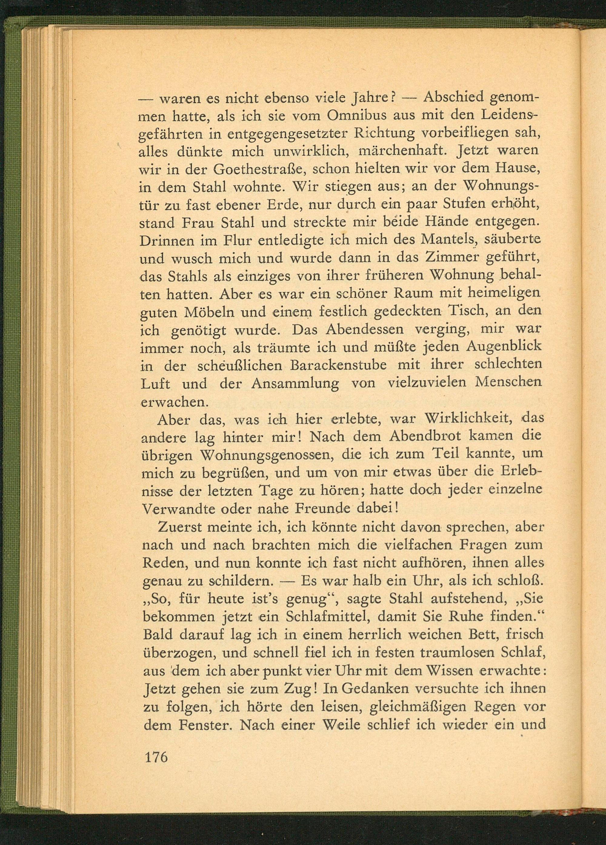 - waren es nicht ebenso viele Jahre? men hatte, als ich sie vom Omnibus aus mit den Leidensgefährten in entgegengesetzter Richtung vorbeifliegen sah, alles dünkte mich unwirklich, märchenhaft. Jetzt waren wir in der Goethestraße, schon hielten wir vor dem Hause, in dem Stahl wohnte. Wir stiegen aus; an der Wohnungstür zu fast ebener Erde, nur durch ein paar Stufen erhöht, stand Frau Stahl und streckte mir beide Hände entgegen. Drinnen im Flur entledigte ich mich des Mantels, säuberte und wusch mich und wurde dann in das Zimmer geführt, das Stahls als einziges von ihrer früheren Wohnung behalten hatten. Aber es war ein schöner Raum mit heimeligen guten Möbeln und einem festlich gedeckten Tisch, an den ich genötigt wurde. Das Abendessen verging, mir war immer noch, als träumte ich und müßte jeden Augenblick in der scheußlichen Barackenstube mit ihrer schlechten Luft und der Ansammlung von vielzuvielen Menschen erwachen.