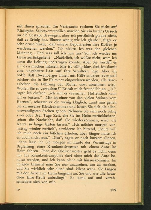 mit Ihnen sprechen. Im Vertrauen: rechnen Sie nicht auf Rückgabe. Selbstverständlich machen Sie ein kurzes Gesuch an die Gestapo deswegen, aber ich persönlich glaube nicht, daß es Erfolg hat. Ebenso wenig wie ich glaube", fügte er sehr ernst hinzu ,,, daß unsere Deportierten ihre Koffer je wiedersehen werden." Ich nickte, ich war der gleichen Meinung. ,, Und was soll ich nun tun? Soll ich wieder ins Heim zurückgehen?" ,, Natürlich, ich wüßte nicht, wem ich sonst die Leitung übertragen könnte. Aber Sie werden es allein machen müssen. Mir ist völlig klar, daß ich damit eine ungeheure Last auf Ihre Schultern lege. Aber ich hoffe, daß Löwenberger Ihnen mit Hilfe anderer, eventuell solcher, die in Ihr Heim neu eingewiesen werden, alle Büroarbeiten, die Führung der Bücher usw. abnehmen wird. Wollen Sie es versuchen?" Er sah mich freundlich an. ,, Ja", sagte ich einfach ,,, ich will es versuchen. Hoffentlich kann ich es leisten." ,, Mir ist einer von den vielen Steinen vom Herzen", scherzte er ein wenig kläglich ,,, und nun gehen Sie zu unserer Kleiderkammer und lassen Sie sich die allernotwendigsten Sachen geben. Nehmen Sie sich noch ruhig zwei oder drei Tage Zeit, ehe Sie ins Heim zurückkehren, schon die Nachricht, daß Sie wiederkommen, wird die Karre so lange laufen lassen." ,, Ich möchte morgen vormittag wieder zurück", erwiderte ich bittend ,,, heute will ich mich noch ein bißchen erholen, aber länger halte ich es doch nicht aus." ,, Gut", sagte er nach kurzem Sinnen, ,, dann lasse ich Sie morgen im Laufe des Vormittags in Begleitung einer Krankenschwester mit einem Auto ins Heim fahren. Ohne die Oberschwester geht es nicht, denn nur für Krankentransporte darf ohne mich das Auto benutzt werden, und ich kann nicht mit hinauskommen. Im übrigen braucht man Sie nur anzusehen, um zu merken, daß Sie wirklich sehr elend sind. Nicht wahr, Sie fangen mit der Arbeit im Heim langsam an, Sie und wir alle brauchen Ihre Kraft unbedingt." Er stand auf und verabschiedete sich von mir.