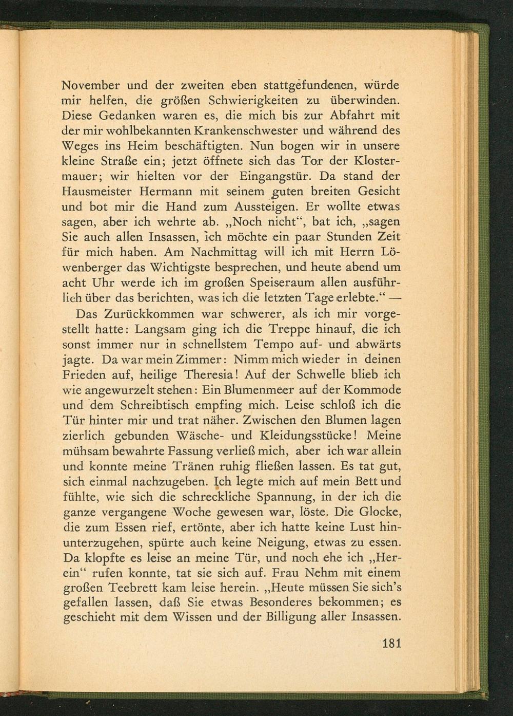 Das Zurückkommen war schwerer, als ich mir vorgestellt hatte: Langsam ging ich die Treppe hinauf, die ich sonst immer nur in schnellstem Tempo auf- und abwärts jagte. Da war mein Zimmer: Nimm mich wieder in deinen Frieden auf, heilige Theresia! Auf der Schwelle blieb ich wie angewurzelt stehen: Ein Blumenmeer auf der Kommode und dem Schreibtisch empfing mich. Leise schloß ich die Tür hinter mir und trat näher. Zwischen den Blumen lagen zierlich gebunden Wäsche- und Kleidungsstücke! Meine mühsam bewahrte Fassung verließ mich, aber ich war allein und konnte meine Tränen ruhig fließen lassen. Es tat gut, sich einmal nachzugeben. Ich legte mich auf mein Bett und fühlte, wie sich die schreckliche Spannung, in der ich die ganze vergangene Woche gewesen war, löste. Die Glocke, die zum Essen rief, ertönte, aber ich hatte keine Lust hinunterzugehen, spürte auch keine Neigung, etwas zu essen. Da klopfte es leise an meine Tür, und noch ehe ich ,, Herein" rufen konnte, tat sie sich auf. Frau Nehm mit einem großen Teebrett kam leise herein. ,, Heute müssen Sie sich's gefallen lassen, daß Sie etwas Besonderes bekommen; es geschieht mit dem Wissen und der Billigung aller Insassen.