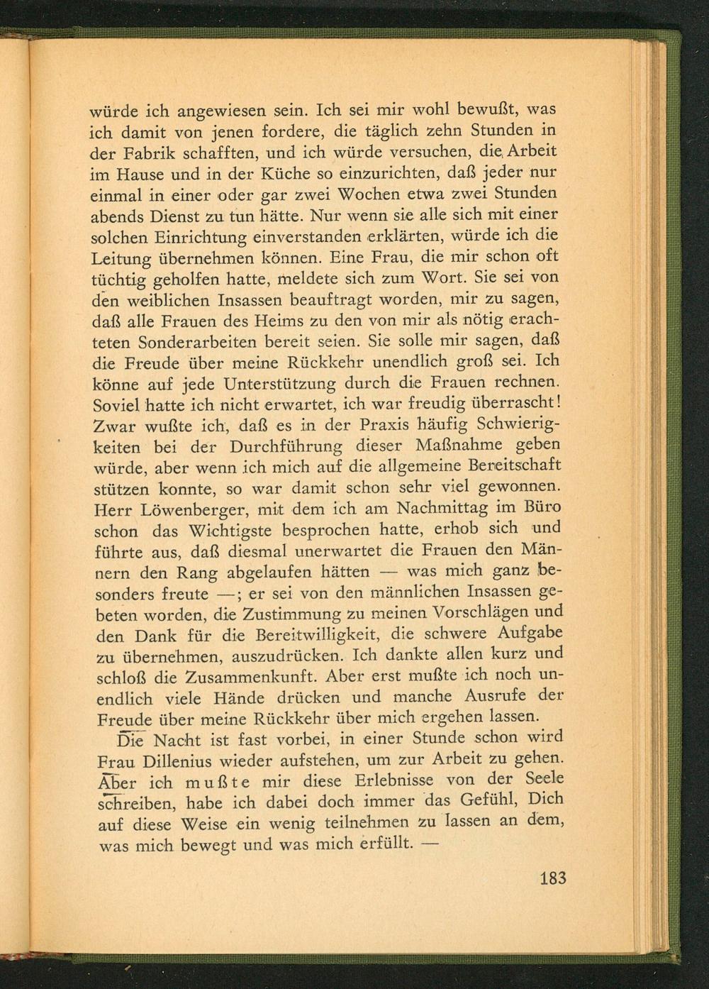 würde ich angewiesen sein. Ich sei mir wohl bewußt, was ich damit von jenen fordere, die täglich zehn Stunden in der Fabrik schafften, und ich würde versuchen, die Arbeit im Hause und in der Küche so einzurichten, daß jeder nur einmal in einer oder gar zwei Wochen etwa zwei Stunden abends Dienst zu tun hätte. Nur wenn sie alle sich mit einer solchen Einrichtung einverstanden erklärten, würde ich die Leitung übernehmen können. Eine Frau, die mir schon oft tüchtig geholfen hatte, meldete sich zum Wort. Sie sei von den weiblichen Insassen beauftragt worden, mir zu sagen, daß alle Frauen des Heims zu den von mir als nötig erachteten Sonderarbeiten bereit seien. Sie solle mir sagen, daß die Freude über meine Rückkehr unendlich groß sei. Ich könne auf jede Unterstützung durch die Frauen rechnen. Soviel hatte ich nicht erwartet, ich war freudig überrascht! Zwar wußte ich, daß es in der Praxis häufig Schwierigkeiten bei der Durchführung dieser Maßnahme geben würde, aber wenn ich mich auf die allgemeine Bereitschaft stützen konnte, so war damit schon sehr viel gewonnen. Herr Löwenberger, mit dem ich am Nachmittag im Büro schon das Wichtigste besprochen hatte, erhob sich und führte aus, daß diesmal unerwartet die Frauen den Männern den Rang abgelaufen hätten was mich ganz besonders freute; er sei von den männlichen Insassen gebeten worden, die Zustimmung zu meinen Vorschlägen und den Dank für die Bereitwilligkeit, die schwere Aufgabe zu übernehmen, auszudrücken. Ich dankte allen kurz und schloß die Zusammenkunft. Aber erst mußte ich noch unendlich viele Hände drücken und manche Ausrufe der Freude über meine Rückkehr über mich ergehen lassen.