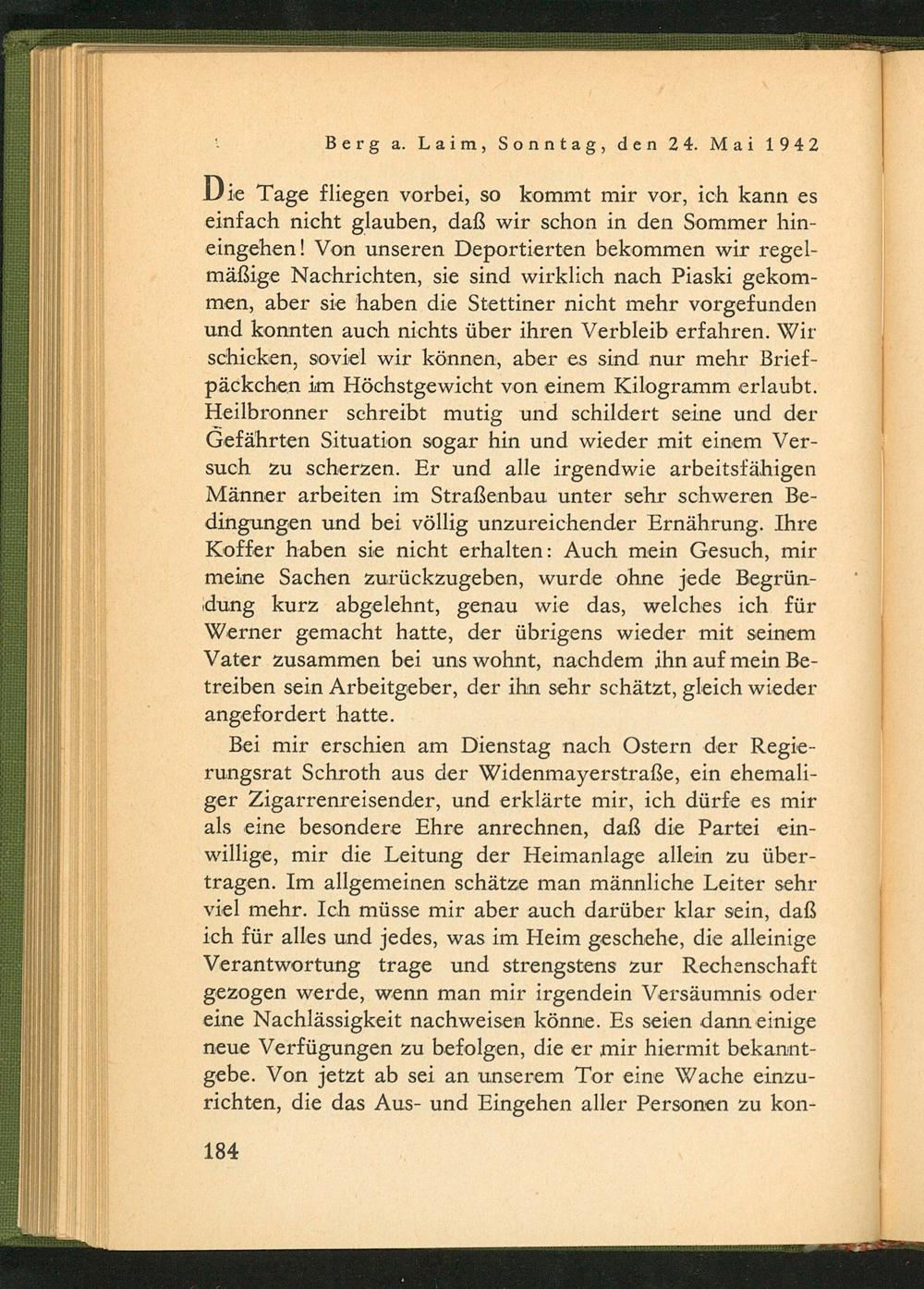 Bei mir erschien am Dienstag nach Ostern der Regierungsrat Schroth aus der Widenmayerstraße, ein ehemaliger Zigarrenreisender, und erklärte mir, ich dürfe es mir als eine besondere Ehre anrechnen, daß die Partei einwillige, mir die Leitung der Heimanlage allein zu übertragen. Im allgemeinen schätze man männliche Leiter sehr viel mehr. Ich müsse mir aber auch darüber klar sein, daß ich für alles und jedes, was im Heim geschehe, die alleinige Verantwortung trage und strengstens zur Rechenschaft gezogen werde, wenn man mir irgendein Versäumnis oder eine Nachlässigkeit nachweisen könne. Es seien dann einige neue Verfügungen zu befolgen, die er mir hiermit bekanntgebe. Von jetzt ab sei an unserem Tor eine Wache einzurichten, die das Aus- und Eingehen aller Personen zu kon
