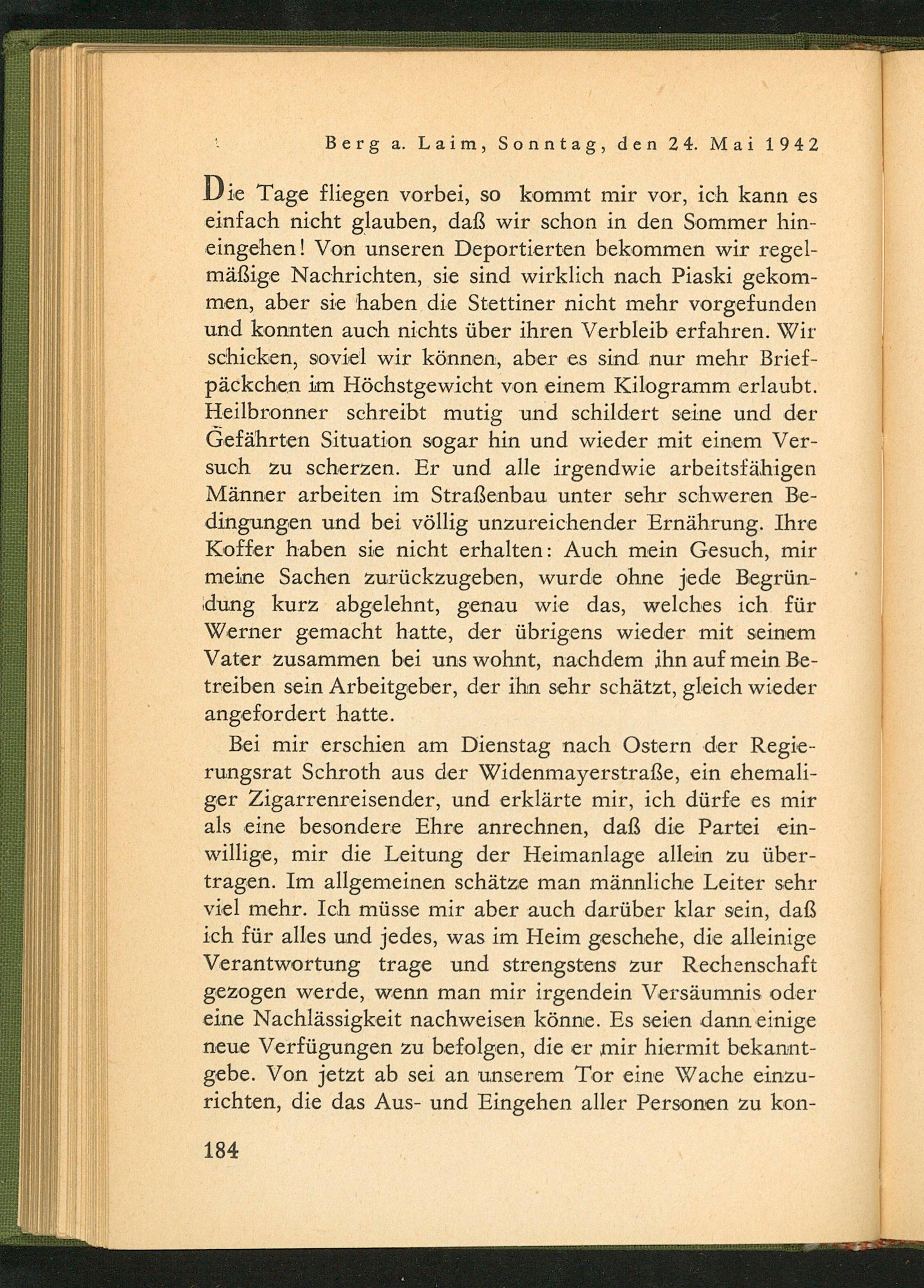 Die Tage fliegen vorbei, so kommt mir vor, ich kann es einfach nicht glauben, daß wir schon in den Sommer hineingehen! Von unseren Deportierten bekommen wir regelmäßige Nachrichten, sie sind wirklich nach Piaski gekommen, aber sie haben die Stettiner nicht mehr vorgefunden und konnten auch nichts über ihren Verbleib erfahren. Wir schicken, soviel wir können, aber es sind nur mehr Briefpäckchen im Höchstgewicht von einem Kilogramm erlaubt. Heilbronner schreibt mutig und schildert seine und der Gefährten Situation sogar hin und wieder mit einem Versuch zu scherzen. Er und alle irgendwie arbeitsfähigen Männer arbeiten im Straßenbau unter sehr schweren Bedingungen und bei völlig unzureichender Ernährung. Ihre Koffer haben sie nicht erhalten: Auch mein Gesuch, mir meine Sachen zurückzugeben, wurde ohne jede Begründung kurz abgelehnt, genau wie das, welches ich für Werner gemacht hatte, der übrigens wieder mit seinem Vater zusammen bei uns wohnt, nachdem ihn auf mein Betreiben sein Arbeitgeber, der ihn sehr schätzt, gleich wieder angefordert hatte.