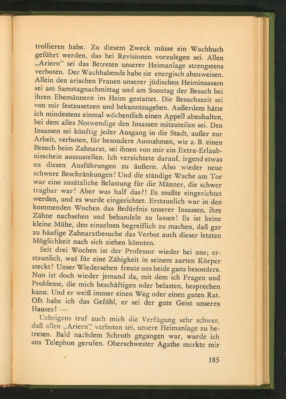 Uebrigens traf auch mich die Verfügung sehr schwer, daß allen ,, Ariern" verboten sei, unsere Heimanlage zu betreten. Bald nachdem Schroth gegangen war, wurde ich ans Telephon gerufen. Oberschwester Agathe merkte mir