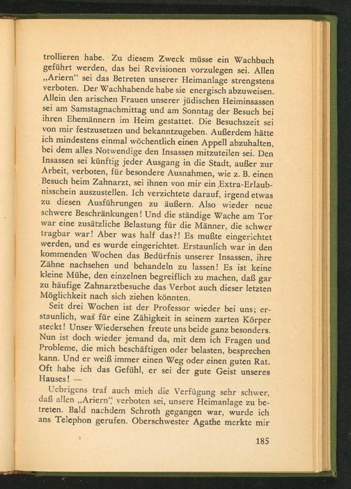 trollieren habe. Zu diesem Zweck müsse ein Wachbuch geführt werden, das bei Revisionen vorzulegen sei. Allen ,, Ariern" sei das Betreten unserer Heimanlage strengstens verboten. Der Wachhabende habe sie energisch abzuweisen. Allein den arischen Frauen unserer jüdischen Heiminsassen sei am Samstagnachmittag und am Sonntag der Besuch bei ihren Ehemännern im Heim gestattet. Die Besuchszeit sei von mir festzusetzen und bekanntzugeben. Außerdem hätte ich mindestens einmal wöchentlich einen Appell abzuhalten, bei dem alles Notwendige den Insassen mitzuteilen sei. Den Insassen sei künftig jeder Ausgang in die Stadt, außer zur Arbeit, verboten, für besondere Ausnahmen, wie z. B. einen Besuch beim Zahnarzt, sei ihnen von mir ein Extra- Erlaubnisschein auszustellen. Ich verzichtete darauf, irgend etwas zu diesen Ausführungen zu äußern. Also wieder neue schwere Beschränkungen! Und die ständige Wache am Tor war eine zusätzliche Belastung für die Männer, die schwer tragbar war! Aber was half das?! Es mußte eingerichtet werden, und es wurde eingerichtet. Erstaunlich war in den kommenden Wochen das Bedürfnis unserer Insassen, ihre Zähne nachsehen und behandeln zu lassen! Es ist keine kleine Mühe, den einzelnen begreiflich zu machen, daß gar zu häufige Zahnarztbesuche das Verbot auch dieser letzten Möglichkeit nach sich ziehen könnten.