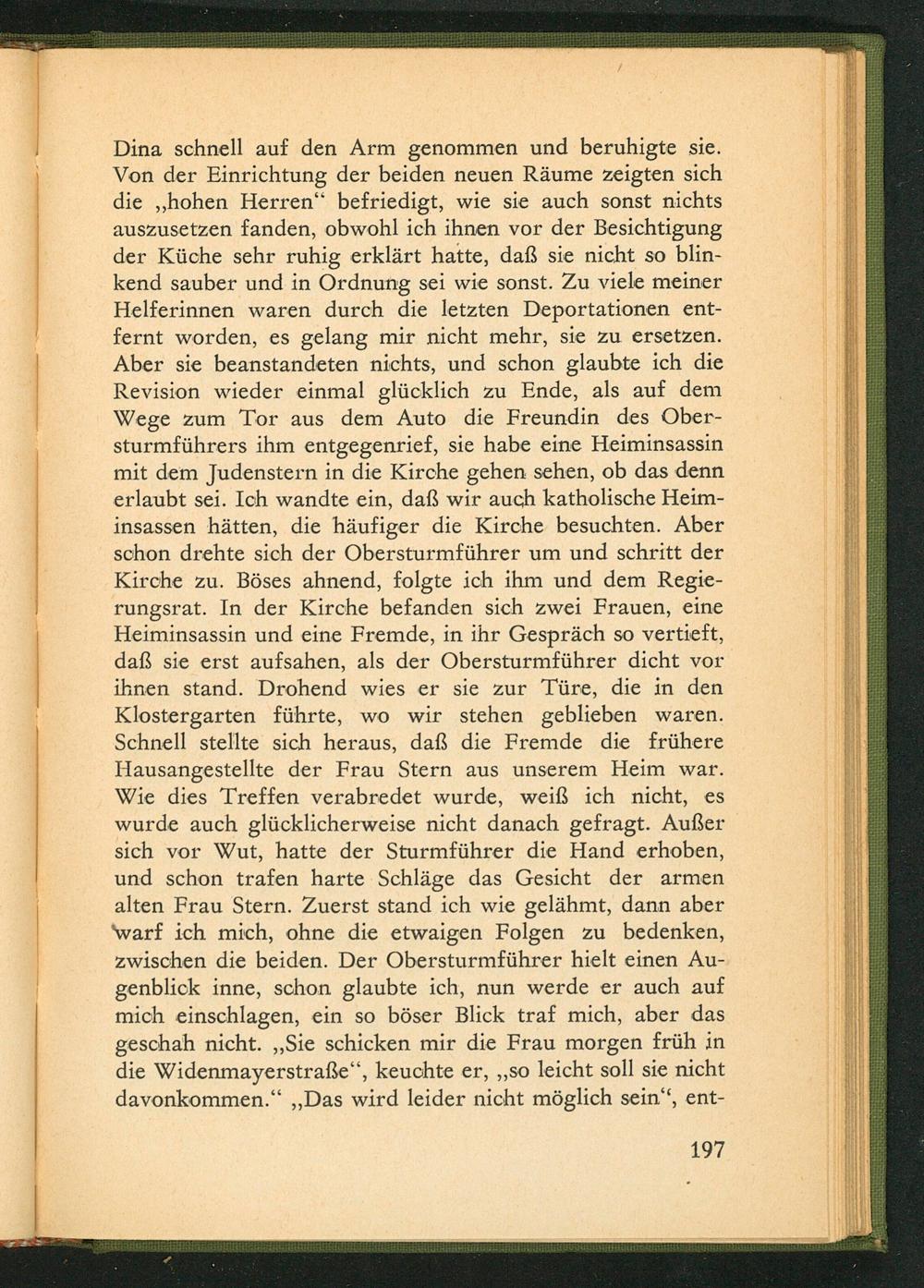 Dina schnell auf den Arm genommen und beruhigte sie. Von der Einrichtung der beiden neuen Räume zeigten sich die ,, hohen Herren" befriedigt, wie sie auch sonst nichts auszusetzen fanden, obwohl ich ihnen vor der Besichtigung der Küche sehr ruhig erklärt hatte, daß sie nicht so blinkend sauber und in Ordnung sei wie sonst. Zu viele meiner Helferinnen waren durch die letzten Deportationen entfernt worden, es gelang mir nicht mehr, sie zu ersetzen. Aber sie beanstandeten nichts, und schon glaubte ich die Revision wieder einmal glücklich zu Ende, als auf dem Wege zum Tor aus dem Auto die Freundin des Obersturmführers ihm entgegenrief, sie habe eine Heiminsassin mit dem Judenstern in die Kirche gehen sehen, ob das denn erlaubt sei. Ich wandte ein, daß wir auch katholische Heiminsassen hätten, die häufiger die Kirche besuchten. Aber schon drehte sich der Obersturmführer um und schritt der Kirche zu. Böses ahnend, folgte ich ihm und dem Regierungsrat. In der Kirche befanden sich zwei Frauen, eine Heiminsassin und eine Fremde, in ihr Gespräch so vertieft, daß sie erst aufsahen, als der Obersturmführer dicht vor ihnen stand. Drohend wies er sie zur Türe, die in den Klostergarten führte, wo wir stehen geblieben waren. Schnell stellte sich heraus, daß die Fremde die frühere Hausangestellte der Frau Stern aus unserem Heim war. Wie dies Treffen verabredet wurde, weiß ich nicht, es wurde auch glücklicherweise nicht danach gefragt. Außer sich vor Wut, hatte der Sturmführer die Hand erhoben, und schon trafen harte Schläge das Gesicht der armen alten Frau Stern. Zuerst stand ich wie gelähmt, dann aber warf ich mich, ohne die etwaigen Folgen zu bedenken, zwischen die beiden. Der Obersturmführer hielt einen Augenblick inne, schon glaubte ich, nun werde er auch auf mich einschlagen, ein so böser Blick traf mich, aber das geschah nicht. ,, Sie schicken mir die Frau morgen früh in die Widenmayerstraße", keuchte er ,,, so leicht soll sie nicht davonkommen." ,, Das wird leider nicht möglich sein“, ent