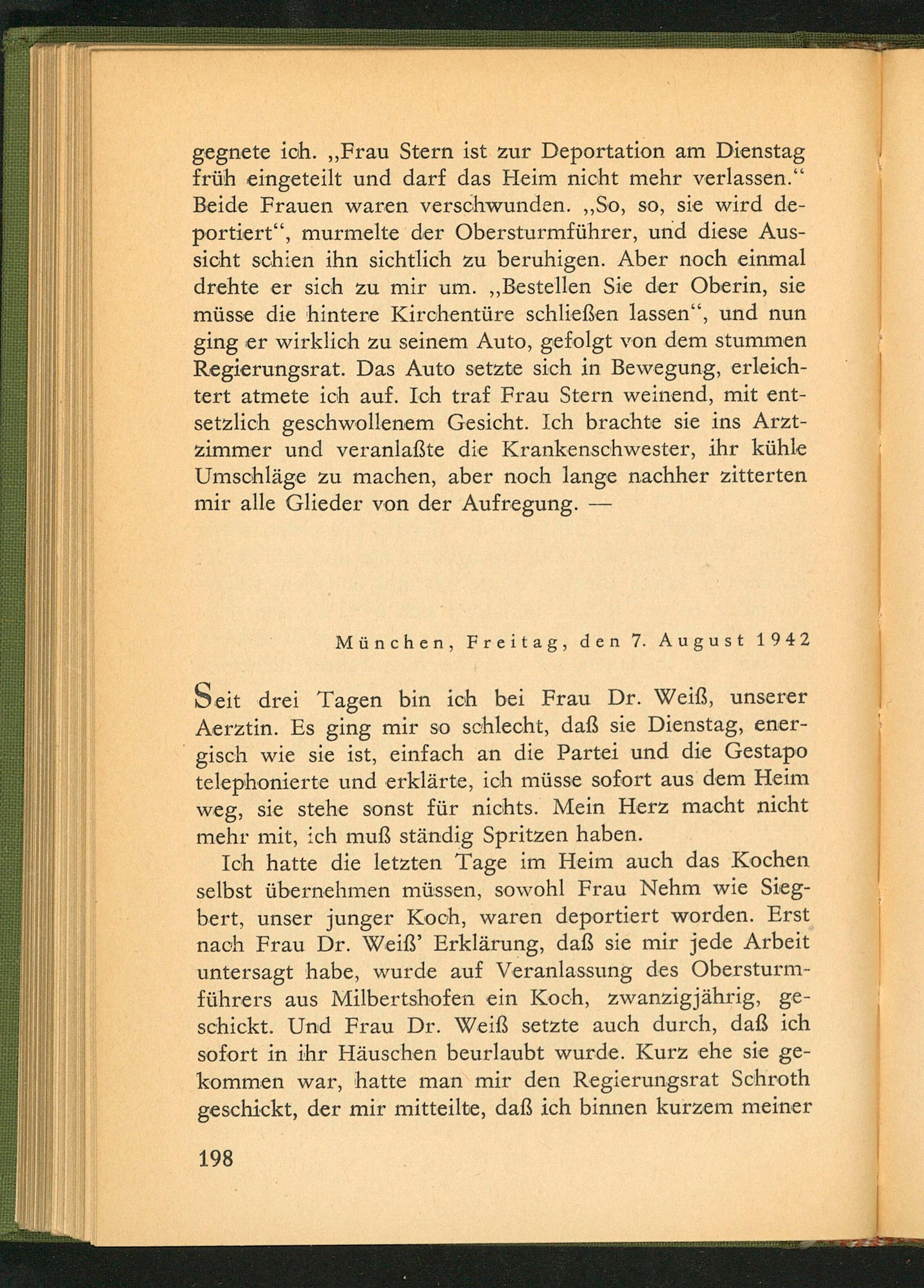 Ich hatte die letzten Tage im Heim auch das Kochen selbst übernehmen müssen, sowohl Frau Nehm wie Siegbert, unser junger Koch, waren deportiert worden. Erst nach Frau Dr. Weiß' Erklärung, daß sie mir jede Arbeit untersagt habe, wurde auf Veranlassung des Obersturmführers aus Milbertshofen ein Koch, zwanzigjährig, geschickt. Und Frau Dr. Weiß setzte auch durch, daß ich sofort in ihr Häuschen beurlaubt wurde. Kurz ehe sie gekommen war, hatte man mir den Regierungsrat Schroth geschickt, der mir mitteilte, daß ich binnen kurzem meiner