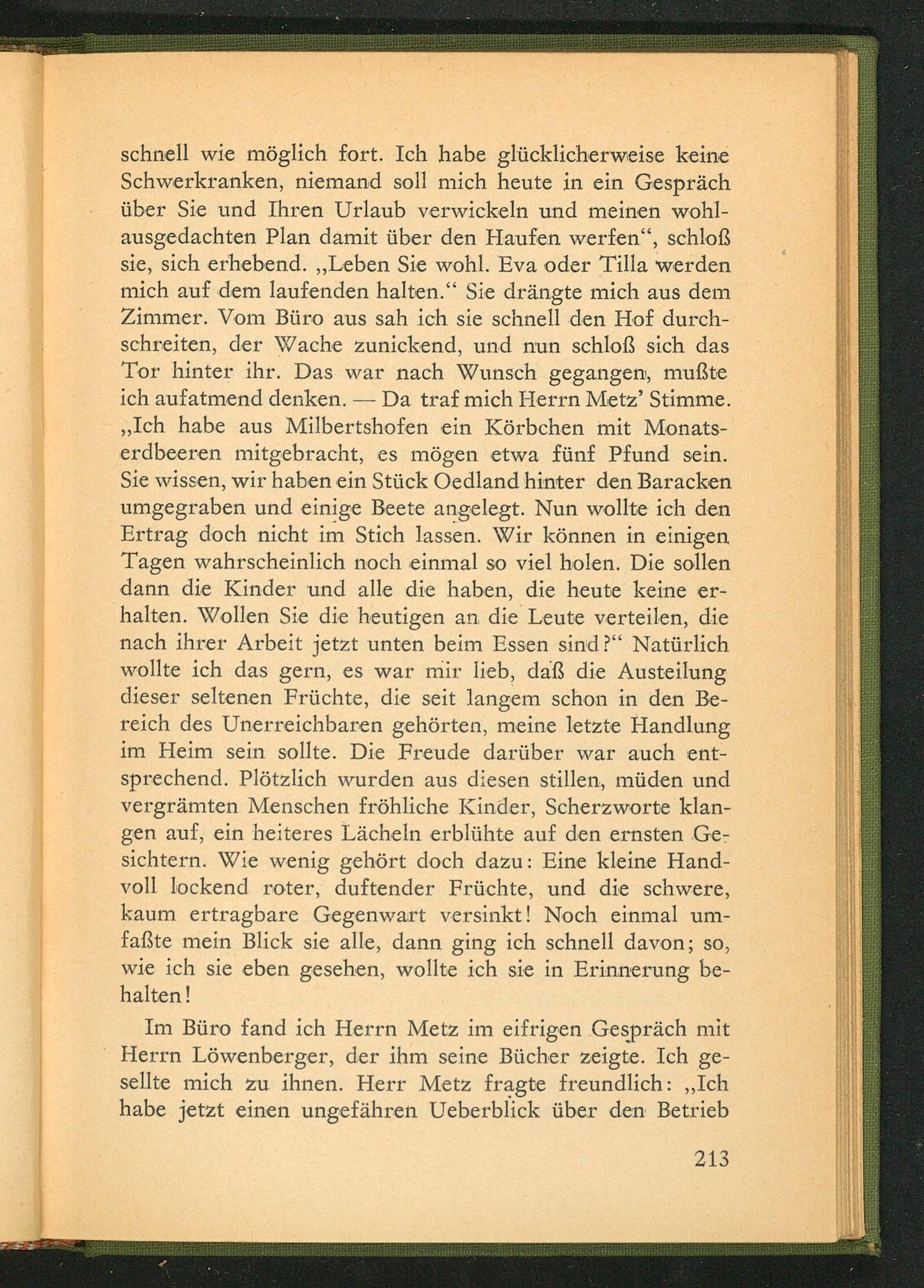 schnell wie möglich fort. Ich habe glücklicherweise keine Schwerkranken, niemand soll mich heute in ein Gespräch über Sie und Ihren Urlaub verwickeln und meinen wohlausgedachten Plan damit über den Haufen werfen", schloß sie, sich erhebend. ,, Leben Sie wohl. Eva oder Tilla werden mich auf dem laufenden halten." Sie drängte mich aus dem Zimmer. Vom Büro aus sah ich sie schnell den Hof durchschreiten, der Wache zunickend, und nun schloß sich das Tor hinter ihr. Das war nach Wunsch gegangen, mußte ich aufatmend denken. Da traf mich Herrn Metz' Stimme. ,, Ich habe aus Milbertshofen ein Körbchen mit Monatserdbeeren mitgebracht, es mögen etwa fünf Pfund sein. Sie wissen, wir haben ein Stück Oedland hinter den Baracken umgegraben und einige Beete angelegt. Nun wollte ich den Ertrag doch nicht im Stich lassen. Wir können in einigen Tagen wahrscheinlich noch einmal so viel holen. Die sollen dann die Kinder und alle die haben, die heute keine erhalten. Wollen Sie die heutigen an die Leute verteilen, die nach ihrer Arbeit jetzt unten beim Essen sind?" Natürlich wollte ich das gern, es war mir lieb, daß die Austeilung dieser seltenen Früchte, die seit langem schon in den Bereich des Unerreichbaren gehörten, meine letzte Handlung im Heim sein sollte. Die Freude darüber war auch entsprechend. Plötzlich wurden aus diesen stillen, müden und vergrämten Menschen fröhliche Kinder, Scherzworte klangen auf, ein heiteres Lächeln erblühte auf den ernsten Gesichtern. Wie wenig gehört doch dazu: Eine kleine Handvoll lockend roter, duftender Früchte, und die schwere, kaum ertragbare Gegenwart versinkt! Noch einmal umfaẞte mein Blick sie alle, dann ging ich schnell davon; so, wie ich sie eben gesehen, wollte ich sie in Erinnerung behalten!