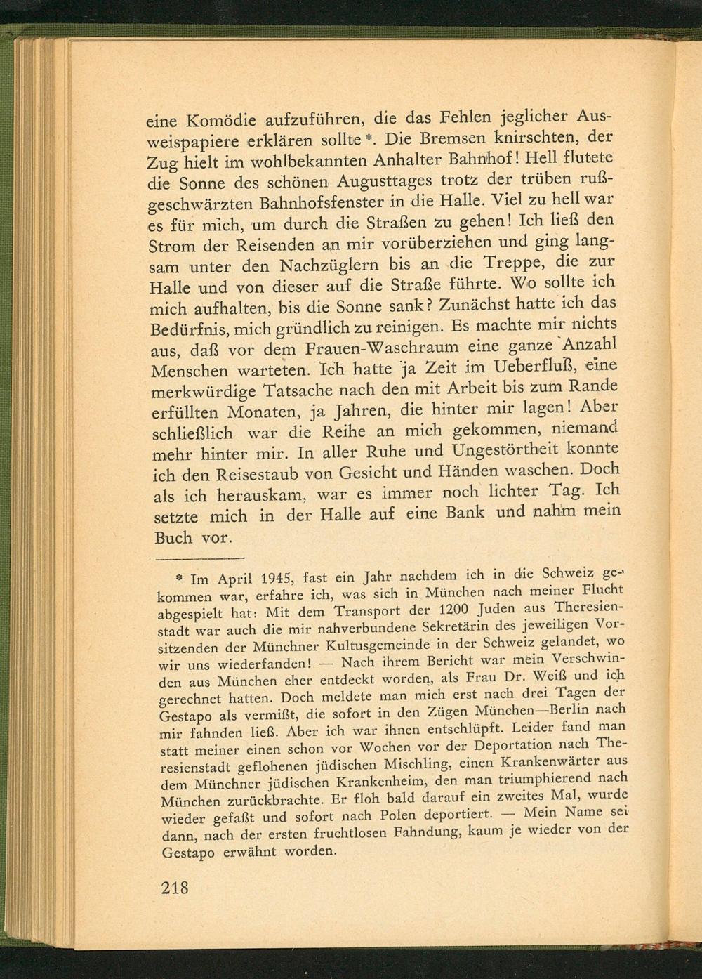 * Im April 1945, fast ein Jahr nachdem ich in die Schweiz gekommen war, erfahre ich, was sich in München nach meiner Flucht abgespielt hat: Mit dem Transport der 1200 Juden aus Theresienstadt war auch die mir nahverbundene Sekretärin des jeweiligen Vorsitzenden der Münchner Kultusgemeinde in der Schweiz gelandet, wo wir uns wiederfanden! Nach ihrem Bericht war mein Verschwinden aus München eher entdeckt worden, als Frau Dr. Weiß und ich gerechnet hatten. Doch meldete man mich erst nach drei Tagen der Gestapo als vermißt, die sofort in den Zügen München- Berlin nach mir fahnden ließ. Aber ich war ihnen entschlüpft. Leider fand man statt meiner einen schon vor Wochen vor der Deportation nach Theresienstadt geflohenen jüdischen Mischling, einen Krankenwärter aus dem Münchner jüdischen Krankenheim, den man triumphierend nach München zurückbrachte. Er floh bald darauf ein zweites Mal, wurde Mein Name sei wieder gefaßt und sofort nach Polen deportiert. dann, nach der ersten fruchtlosen Fahndung, kaum je wieder von der Gestapo erwähnt worden.