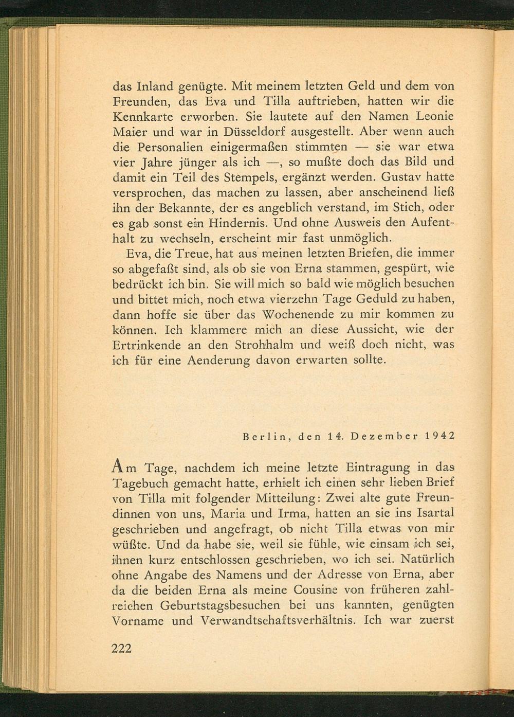 das Inland genügte. Mit meinem letzten Geld und dem von Freunden, das Eva und Tilla auftrieben, hatten wir die Kennkarte erworben. Sie lautete auf den Namen Leonie Maier und war in Düsseldorf ausgestellt. Aber wenn auch die Personalien einigermaßen stimmten sie war etwa vier Jahre jünger als ich, so mußte doch das Bild und damit ein Teil des Stempels, ergänzt werden. Gustav hatte versprochen, das machen zu lassen, aber anscheinend ließ ihn der Bekannte, der es angeblich verstand, im Stich, oder es gab sonst ein Hindernis. Und ohne Ausweis den Aufenthalt zu wechseln, erscheint mir fast unmöglich.