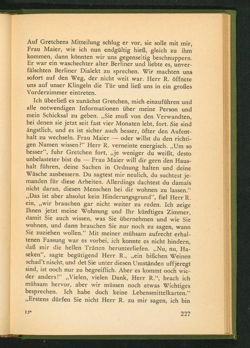 Ich überließ es zunächst Gretchen, mich einzuführen und alle notwendigen Informationen über meine Person und mein Schicksal zu geben. ,, Sie muß von den Verwandten, bei denen sie jetzt seit fast vier Monaten lebt, fort. Sie sind ängstlich, und es ist sicher auch besser, öfter den Aufenthalt zu wechseln. Frau Maier oder willst du den richtigen Namen wissen?" Herr R. verneinte energisch. ,, Um so besser", fuhr Gretchen fort ,,, je weniger du weißt, desto unbelasteter bist du Frau Maier will dir gern den Haushalt führen, deine Sachen in Ordnung halten und deine Wäsche ausbessern. Du sagtest mir neulich, du suchtest jemanden für diese Arbeiten. Allerdings dachtest du damals nicht daran, diesen Menschen bei dir wohnen zu lassen." ,, Das ist aber absolut kein Hinderungsgrund", fiel Herr R. ein ,,, wir brauchen gar nicht weiter zu reden. Ich zeige Ihnen jetzt meine Wohnung und Ihr künftiges Zimmer, damit Sie auch wissen, was Sie übernehmen und wie Sie wohnen, und dann brauchen Sie nur noch zu sagen, wann Sie zuziehen wollen." Mit meiner mühsam aufrecht erhaltenen Fassung war es vorbei, ich konnte es nicht hindern, daß mir die hellen Tränen herunterliefen. ,, Nu, nu, Haseken", sagte begütigend Herr R. ,,, ein bißchen Weinen schad't nischt, und det Sie unter diesen Umständen uffjeregt sind, ist ooch nur zu begreiflich. Aber es kommt ooch wieder anders!" ,, Vielen, vielen Dank, Herr R.", brach ich mühsam hervor, aber wir müssen noch etwas Wichtiges besprechen. Ich habe doch keine Lebensmittelkarten." ,, Erstens dürfen Sie nicht Herr R. zu mir sagen, ich bin