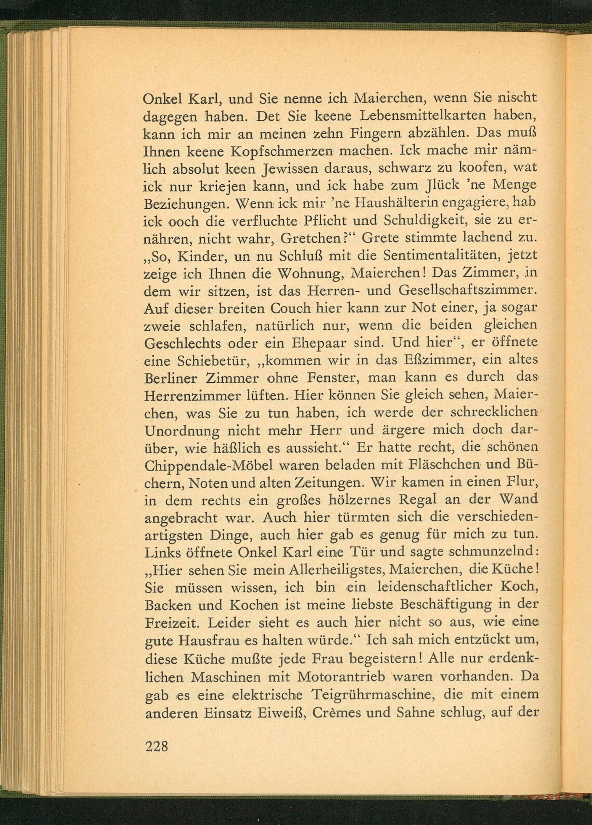 Onkel Karl, und Sie nenne ich Maierchen, wenn Sie nischt dagegen haben. Det Sie keene Lebensmittelkarten haben, kann ich mir an meinen zehn Fingern abzählen. Das muẞ Ihnen keene Kopfschmerzen machen. Ick mache mir nämlich absolut keen Jewissen daraus, schwarz zu koofen, wat ick nur kriejen kann, und ick habe zum Jlück' ne Menge Beziehungen. Wenn ick mir' ne Haushälterin engagiere, hab ick ooch die verfluchte Pflicht und Schuldigkeit, sie zu ernähren, nicht wahr, Gretchen?" Grete stimmte lachend zu. ,, So, Kinder, un nu Schluß mit die Sentimentalitäten, jetzt zeige ich Ihnen die Wohnung, Maierchen! Das Zimmer, in dem wir sitzen, ist das Herren- und Gesellschaftszimmer. Auf dieser breiten Couch hier kann zur Not einer, ja sogar zweie schlafen, natürlich nur, wenn die beiden gleichen Geschlechts oder ein Ehepaar sind. Und hier", er öffnete eine Schiebetür ,,, kommen wir in das Eẞzimmer, ein altes Berliner Zimmer ohne Fenster, man kann es durch das Herrenzimmer lüften. Hier können Sie gleich sehen, Maierchen, was Sie zu tun haben, ich werde der schrecklichen Unordnung nicht mehr Herr und ärgere mich doch darüber, wie häßlich es aussieht." Er hatte recht, die schönen Chippendale- Möbel waren beladen mit Fläschchen und Büchern, Noten und alten Zeitungen. Wir kamen in einen Flur, in dem rechts ein großes hölzernes Regal an der Wand angebracht war. Auch hier türmten sich die verschiedenartigsten Dinge, auch hier gab es genug für mich zu tun. Links öffnete Onkel Karl eine Tür und sagte schmunzelnd: ,, Hier sehen Sie mein Allerheiligstes, Maierchen, die Küche! Sie müssen wissen, ich bin ein leidenschaftlicher Koch, Backen und Kochen ist meine liebste Beschäftigung in der Freizeit. Leider sieht es auch hier nicht so aus, wie eine gute Hausfrau es halten würde." Ich sah mich entzückt um, diese Küche mußte jede Frau begeistern! Alle nur erdenklichen Maschinen mit Motorantrieb waren vorhanden. Da gab es eine elektrische Teigrührmaschine, die mit einem anderen Einsatz Eiweiß, Crèmes und Sahne schlug, auf der