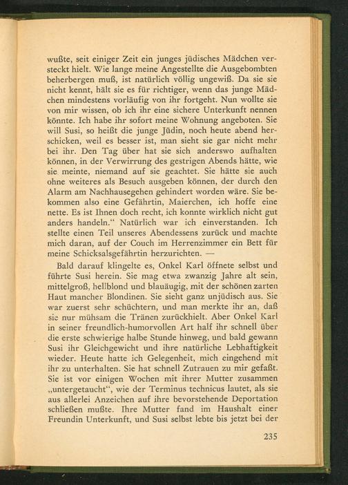 wußte, seit einiger Zeit ein junges jüdisches Mädchen versteckt hielt. Wie lange meine Angestellte die Ausgebombten beherbergen muß, ist natürlich völlig ungewiß. Da sie sie nicht kennt, hält sie es für richtiger, wenn das junge Mädchen mindestens vorläufig von ihr fortgeht. Nun wollte sie von mir wissen, ob ich ihr eine sichere Unterkunft nennen könnte. Ich habe ihr sofort meine Wohnung angeboten. Sie will Susi, so heißt die junge Jüdin, noch heute abend herschicken, weil es besser ist, man sieht sie gar nicht mehr bei ihr. Den Tag über hat sie sich anderswo aufhalten können, in der Verwirrung des gestrigen Abends hätte, wie sie meinte, niemand auf sie geachtet. Sie hätte sie auch ohne weiteres als Besuch ausgeben können, der durch den Alarm am Nachhausegehen gehindert worden wäre. Sie bekommen also eine Gefährtin, Maierchen, ich hoffe eine nette. Es ist Ihnen doch recht, ich konnte wirklich nicht gut anders handeln." Natürlich war ich einverstanden. Ich stellte einen Teil unseres Abendessens zurück und machte mich daran, auf der Couch im Herrenzimmer ein Bett für meine Schicksalsgefährtin herzurichten.-