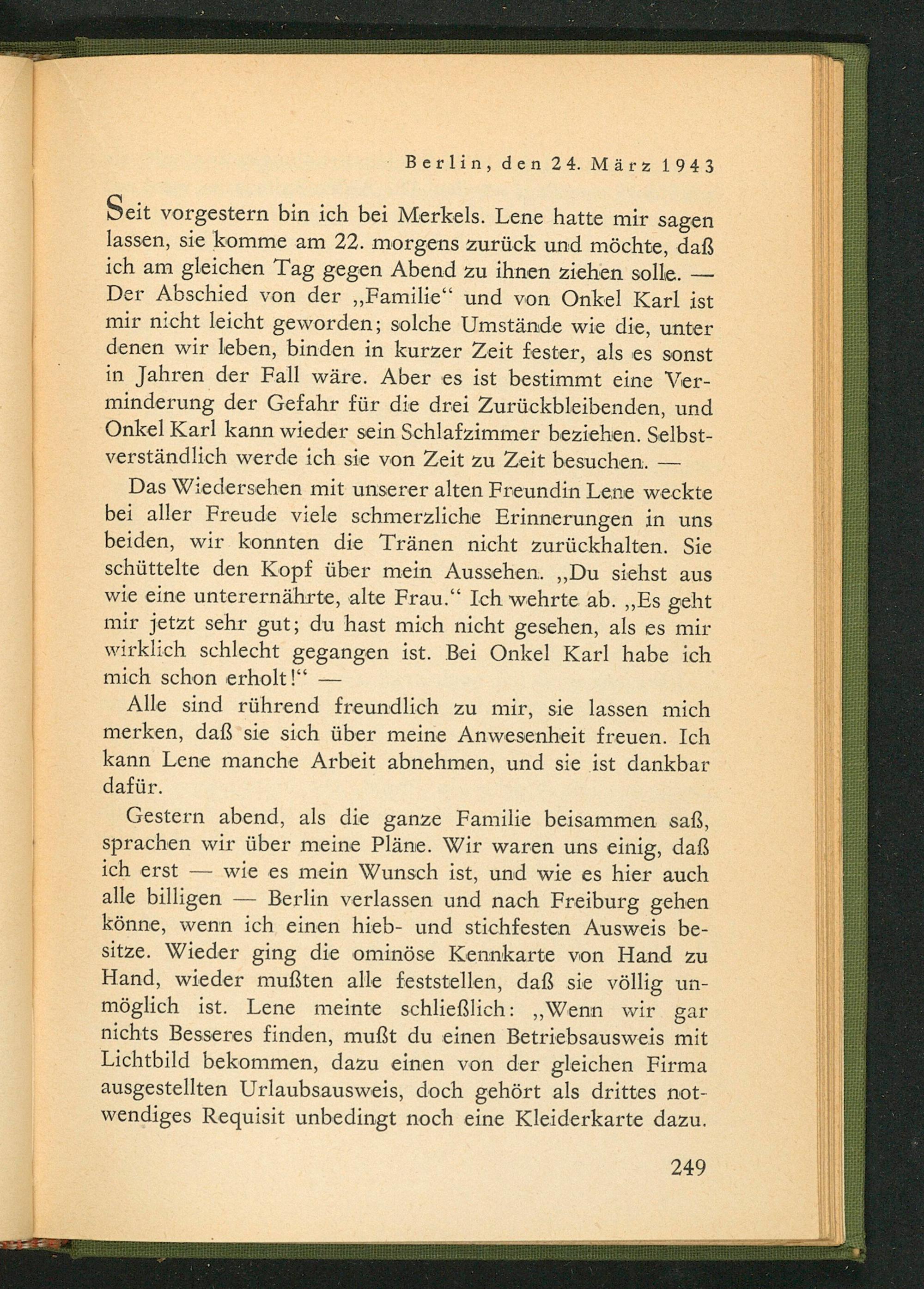 Seit vorgestern bin ich bei Merkels. Lene hatte mir sagen lassen, sie komme am 22. morgens zurück und möchte, daß ich am gleichen Tag gegen Abend zu ihnen ziehen solle.- Der Abschied von der ,, Familie" und von Onkel Karl ist mir nicht leicht geworden; solche Umstände wie die, unter denen wir leben, binden in kurzer Zeit fester, als es sonst in Jahren der Fall wäre. Aber es ist bestimmt eine Verminderung der Gefahr für die drei Zurückbleibenden, und Onkel Karl kann wieder sein Schlafzimmer beziehen. Selbstverständlich werde ich sie von Zeit zu Zeit besuchen.-