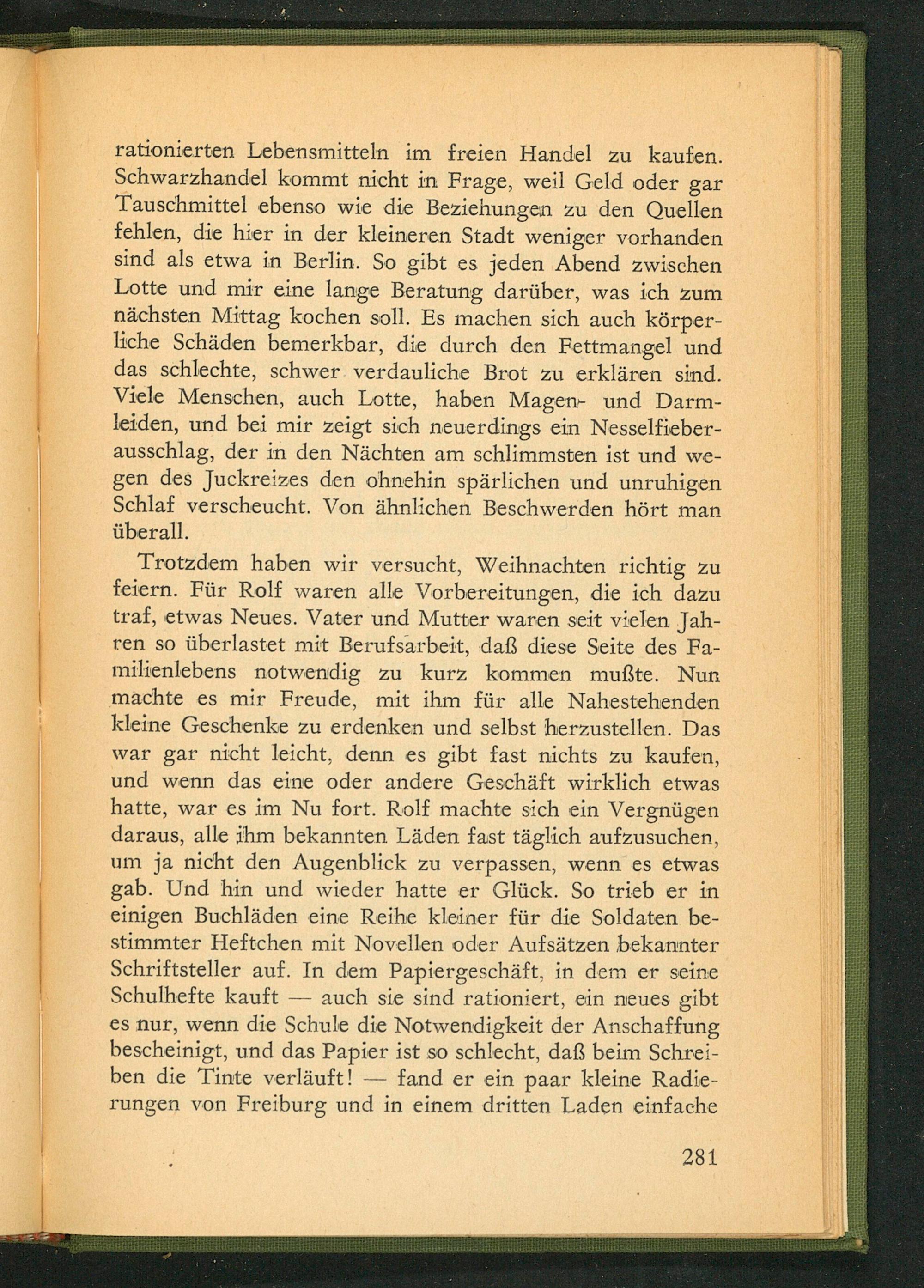 Trotzdem haben wir versucht, Weihnachten richtig zu feiern. Für Rolf waren alle Vorbereitungen, die ich dazu traf, etwas Neues. Vater und Mutter waren seit vielen Jahren so überlastet mit Berufsarbeit, daß diese Seite des Familienlebens notwendig zu kurz kommen mußte. Nun machte es mir Freude, mit ihm für alle Nahestehenden kleine Geschenke zu erdenken und selbst herzustellen. Das war gar nicht leicht, denn es gibt fast nichts zu kaufen, und wenn das eine oder andere Geschäft wirklich etwas hatte, war es im Nu fort. Rolf machte sich ein Vergnügen daraus, alle ihm bekannten Läden fast täglich aufzusuchen, um ja nicht den Augenblick zu verpassen, wenn es etwas gab. Und hin und wieder hatte er Glück. So trieb er in einigen Buchläden eine Reihe kleiner für die Soldaten bestimmter Heftchen mit Novellen oder Aufsätzen bekannter Schriftsteller auf. In dem Papiergeschäft, in dem er seine Schulhefte kauft auch sie sind rationiert, ein neues gibt es nur, wenn die Schule die Notwendigkeit der Anschaffung bescheinigt, und das Papier ist so schlecht, daß beim Schreiben die Tinte verläuft! fand er ein paar kleine Radierungen von Freiburg und in einem dritten Laden einfache