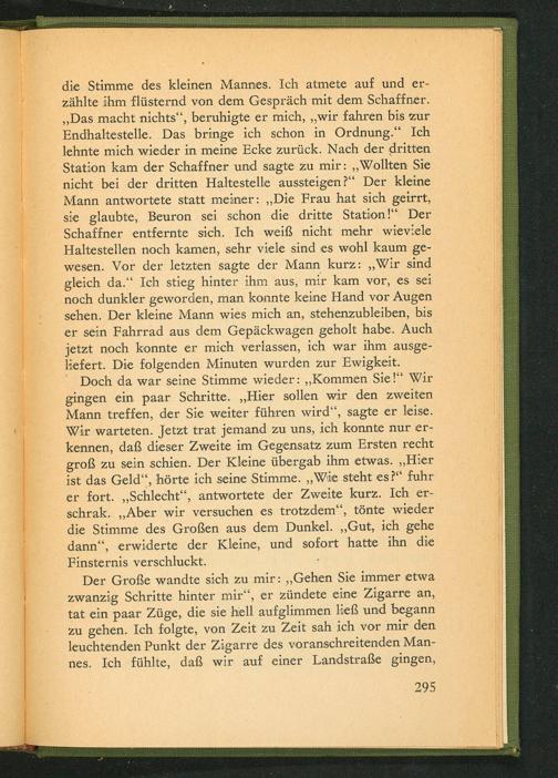Der Große wandte sich zu mir: ,, Gehen Sie immer etwa zwanzig Schritte hinter mir", er zündete eine Zigarre an, tat ein paar Züge, die sie hell aufglimmen ließ und begann zu gehen. Ich folgte, von Zeit zu Zeit sah ich vor mir den leuchtenden Punkt der Zigarre des voranschreitenden Mannes. Ich fühlte, daß wir auf einer Landstraße gingen,