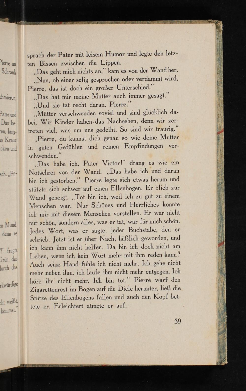 ,, Das habe ich, Pater Victor!" drang es wie ein Notschrei von der Wand. ,, Das habe ich und daran bin ich gestorben." Pierre legte sich etwas herum und stützte sich schwer auf einen Ellenbogen. Er blieb zur Wand geneigt. ,, Tot bin ich, weil ich zu gut zu einem Menschen war. Nur Schönes und Herrliches konnte ich mir mit diesem Menschen vorstellen. Er war nicht nur schön, sondern alles, was er tat, war für mich schön. Jedes Wort, was er sagte, jeder Buchstabe, den er schrieb. Jetzt ist er über Nacht häßlich geworden, und ich kann ihm nicht helfen. Da bin ich doch nicht am Leben, wenn ich kein Wort mehr mit ihm reden kann? Auch seine Hand fühle ich nicht mehr. Ich gehe nicht mehr neben ihm, ich laufe ihm nicht mehr entgegen. Ich höre ihn nicht mehr. Ich bin tot." Pierre warf den Zigarettenrest im Bogen auf die Diele herunter, ließ die Stütze des Ellenbogens fallen und auch den Kopf bettete er. Erleichtert atmete er auf.