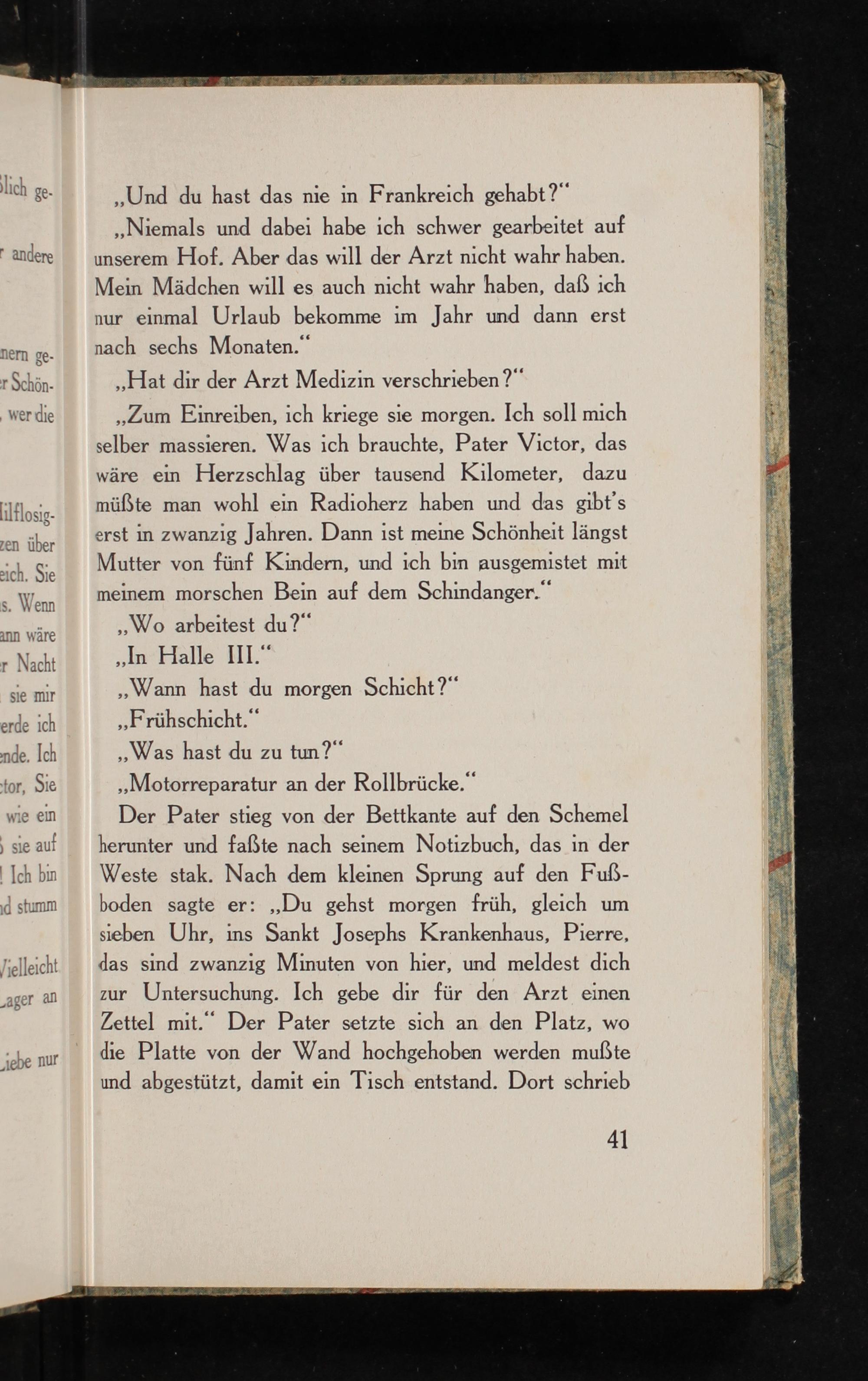 Der Pater stieg von der Bettkante auf den Schemel herunter und faßte nach seinem Notizbuch, das in der Weste stak. Nach dem kleinen Sprung auf den Fußboden sagte er: ,, Du gehst morgen früh, gleich um sieben Uhr, ins Sankt Josephs Krankenhaus, Pierre, das sind zwanzig Minuten von hier, und meldest dich zur Untersuchung. Ich gebe dir für den Arzt einen Zettel mit." Der Pater setzte sich an den Platz, wo die Platte von der Wand hochgehoben werden mußte und abgestützt, damit ein Tisch entstand. Dort schrieb