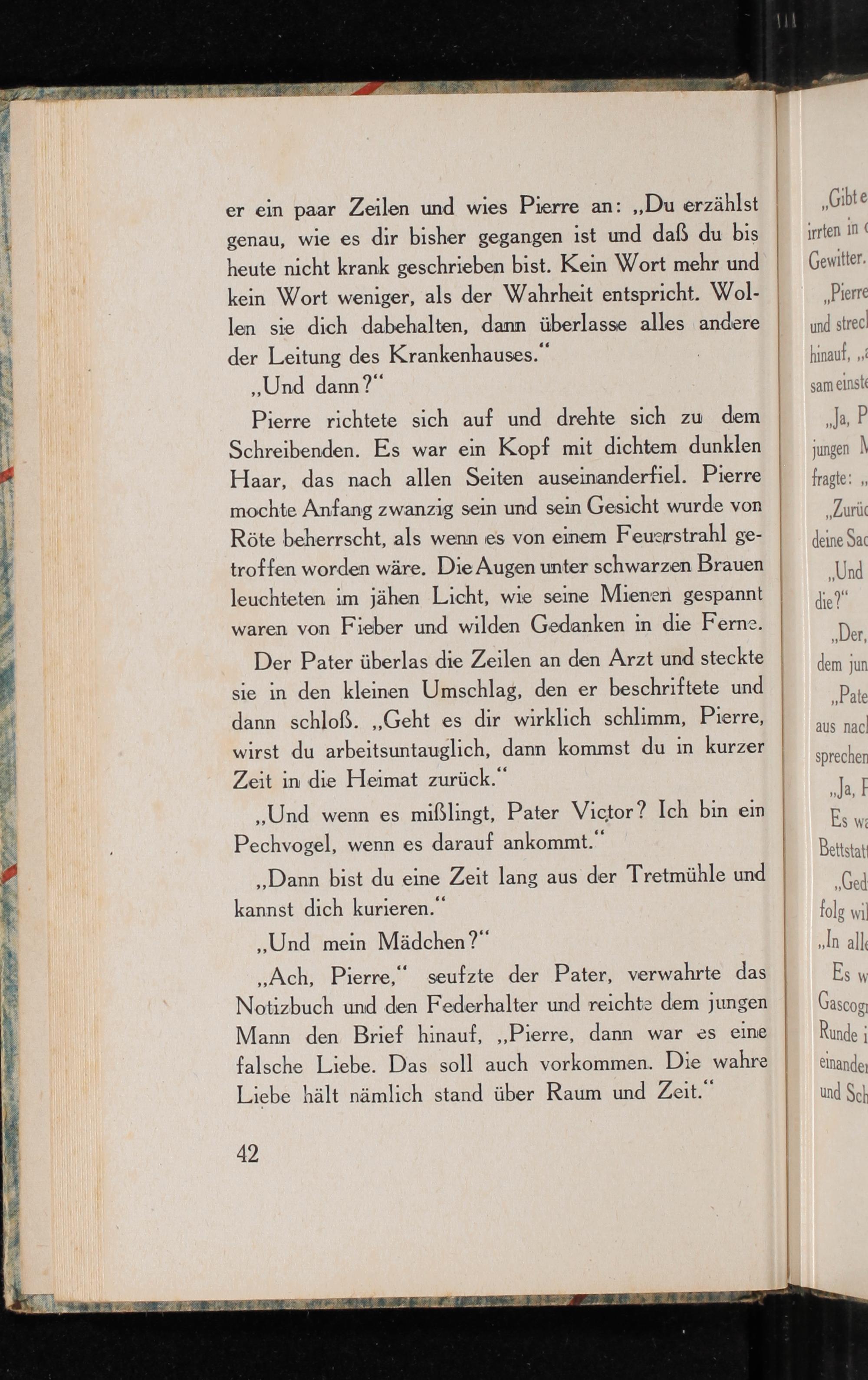 ,, Ach, Pierre," seufzte der Pater, verwahrte das Notizbuch und den Federhalter und reichte dem jungen Mann den Brief hinauf ,,, Pierre, dann war es eine falsche Liebe. Das soll auch vorkommen. Die wahre Liebe hält nämlich stand über Raum und Zeit."