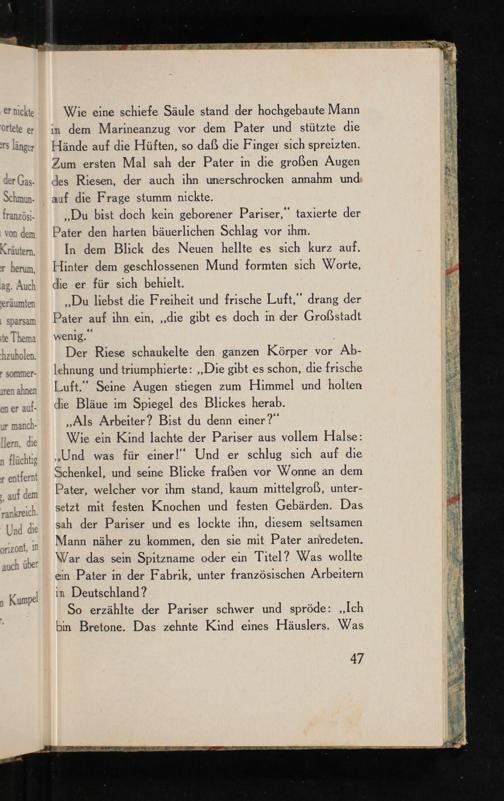 Wie ein Kind lachte der Pariser aus vollem Halse: Und was für einer!" Und er schlug sich auf die Schenkel, und seine Blicke fraßen vor Wonne an dem Pater, welcher vor ihm stand, kaum mittelgroß, untersetzt mit festen Knochen und festen Gebärden. Das sah der Pariser und es lockte ihn, diesem seltsamen