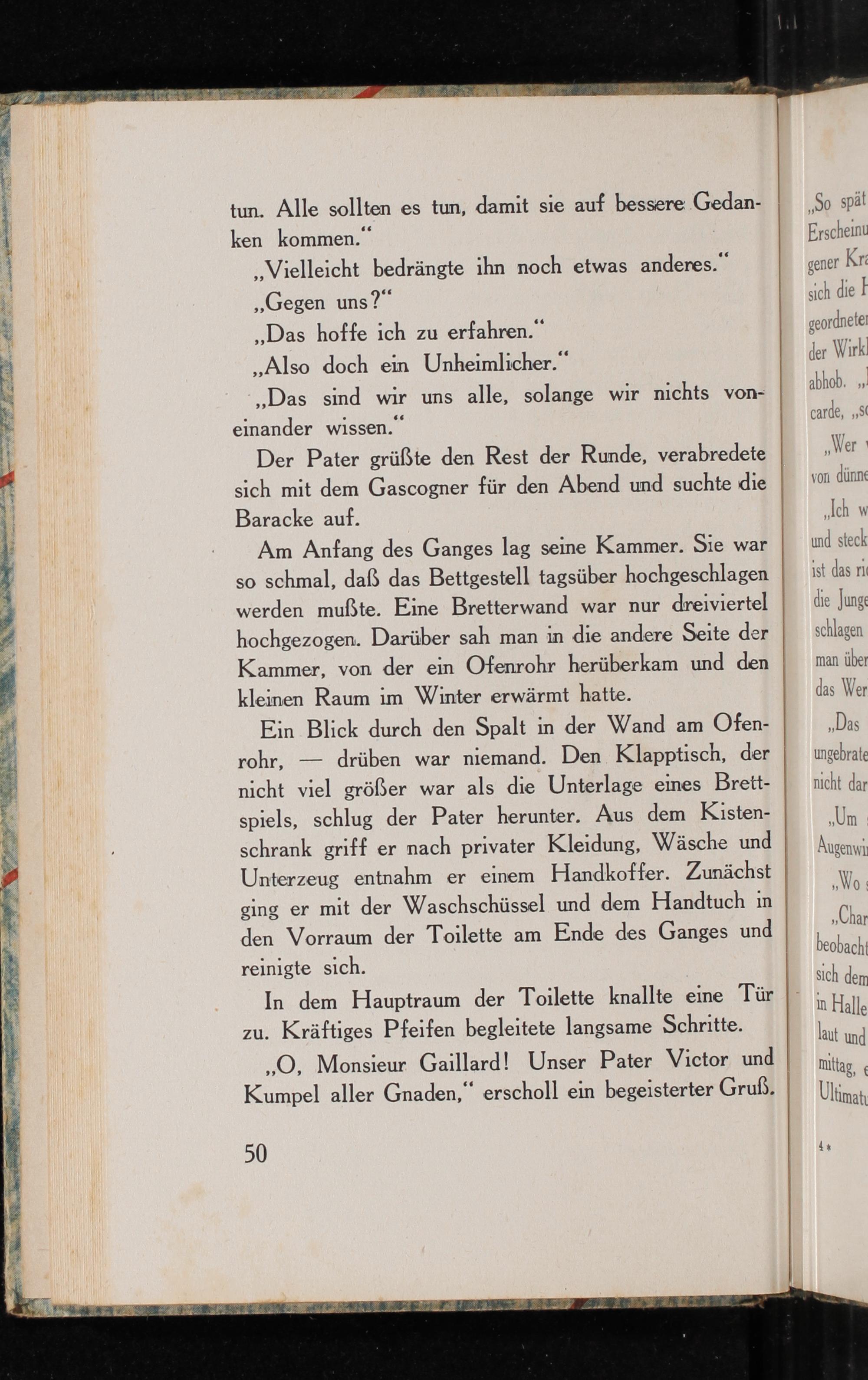 Am Anfang des Ganges lag seine Kammer. Sie war so schmal, daß das Bettgestell tagsüber hochgeschlagen werden mußte. Eine Bretterwand war nur dreiviertel hochgezogen. Darüber sah man in die andere Seite der Kammer, von der ein Ofenrohr herüberkam und den kleinen Raum im Winter erwärmt hatte. Ein Blick durch den Spalt in der Wand am Ofenrohr, drüben war niemand. Den Klapptisch, der nicht viel größer war als die Unterlage eines Brettspiels, schlug der Pater herunter. Aus dem Kistenschrank griff er nach privater Kleidung, Wäsche und Unterzeug entnahm er einem Handkoffer. Zunächst ging er mit der Waschschüssel und dem Handtuch in den Vorraum der Toilette am Ende des Ganges und reinigte sich.