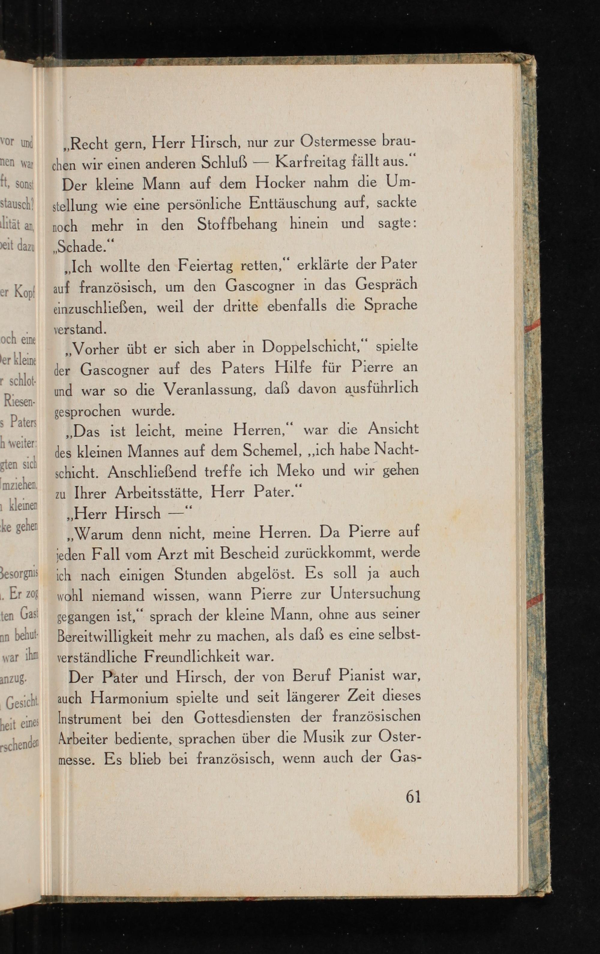 ,, Recht gern, Herr Hirsch, nur zur Ostermesse brauchen wir einen anderen Schluß- Karfreitag fällt aus." Der kleine Mann auf dem Hocker nahm die Umstellung wie eine persönliche Enttäuschung auf, sackte noch mehr in den Stoffbehang hinein und sagte: Schade."