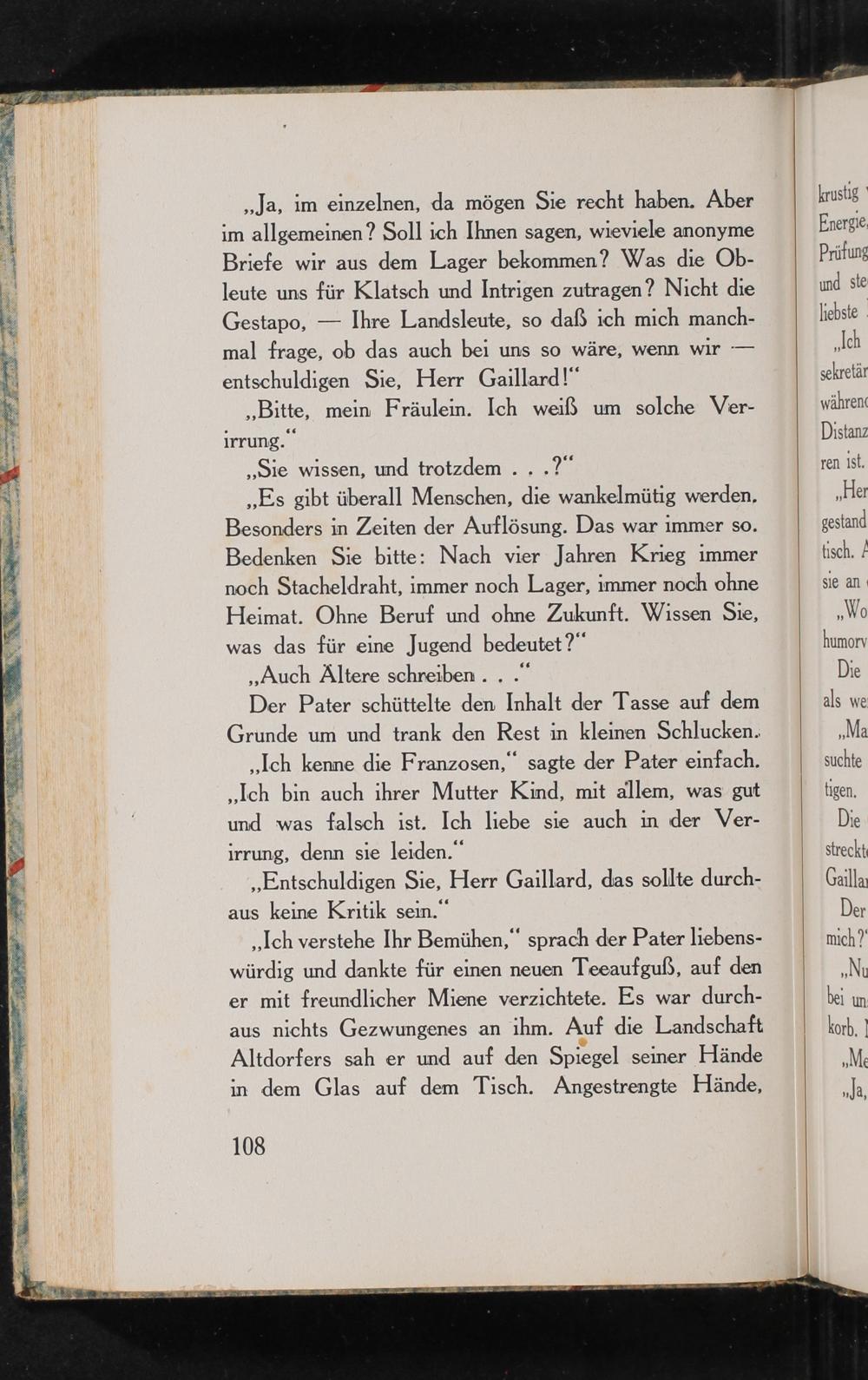 „Ich kenne die Franzosen, “ sagte der Pater einfach. „Ich bin auch ihrer Mutter Kind, mit allem, was gut und was falsch ist. Ich liebe sie auch in der Ver- irrung, denn sie leiden.“