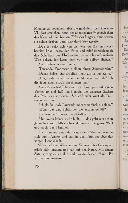 ,, Sie müssen fort," bestand der Gascogner auf seinen Vorschlag und ließ nicht nach, die wenigen Sachen des Paters zu sortieren. ,, Sie sind mehr wert als Tausende von uns." ,, Ich glaube, daß Tausende mehr wert sind, als einer." ,, Wenn der eine fehlt, der sie zusammenhält?"