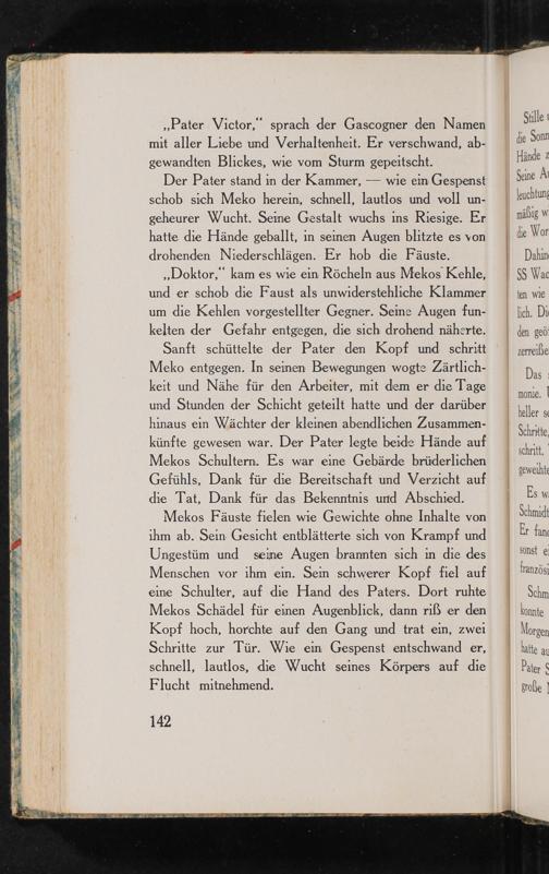 Mekos Fäuste fielen wie Gewichte ohne Inhalte von ihm ab. Sein Gesicht entblätterte sich von Krampf und Ungestüm und seine Augen brannten sich in die des Menschen vor ihm ein. Sein schwerer Kopf fiel auf eine Schulter, auf die Hand des Paters. Dort ruhte Mekos Schädel für einen Augenblick, dann riẞ er den Kopf hoch, horchte auf den Gang und trat ein, zwei Schritte zur Tür. Wie ein Gespenst entschwand er, schnell, lautlos, die Wucht seines Körpers auf die Flucht mitnehmend.