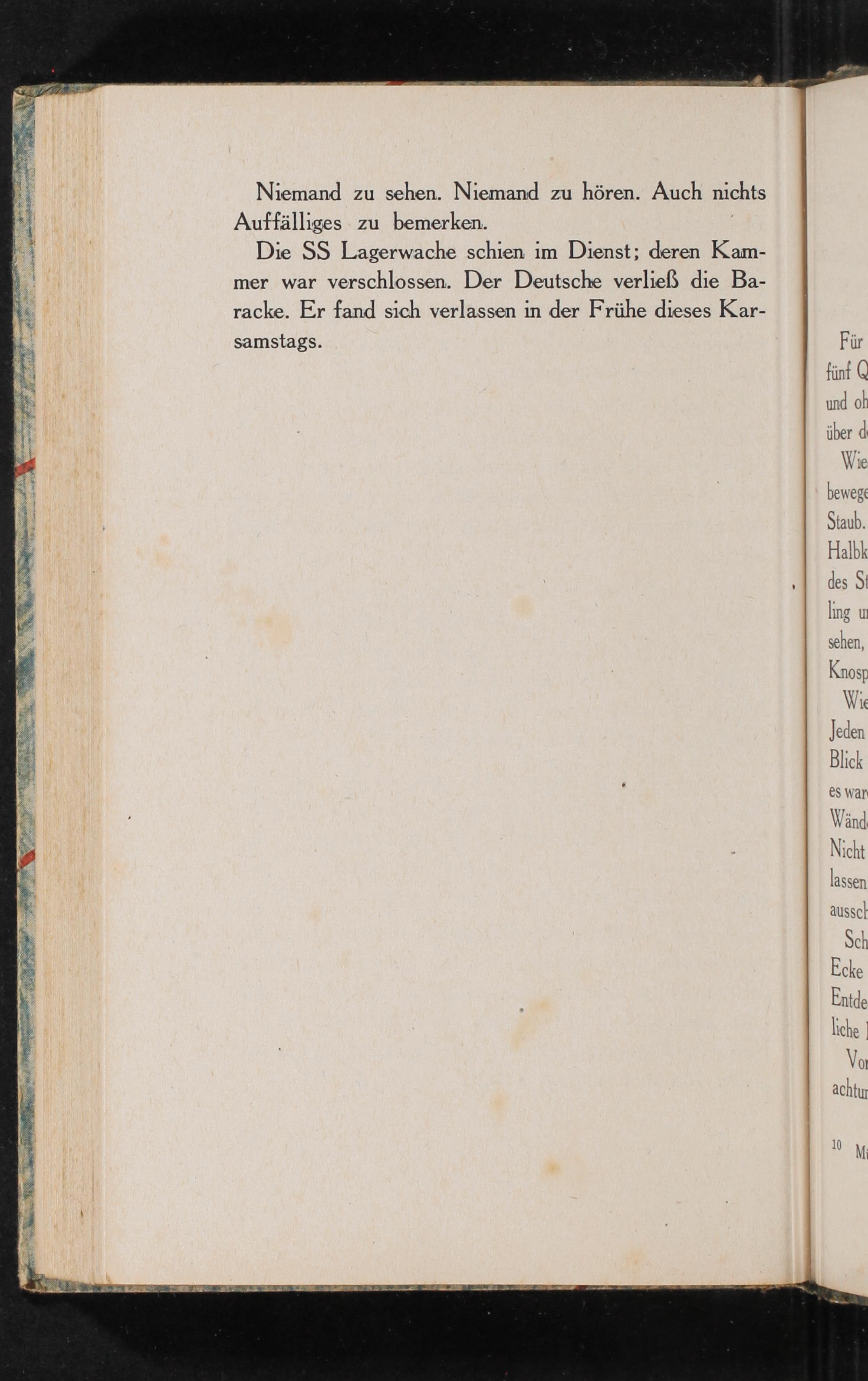 Die SS Lagerwache schien im Dienst; deren Kammer war verschlossen. Der Deutsche verließ die Baracke. Er fand sich verlassen in der Frühe dieses Kar