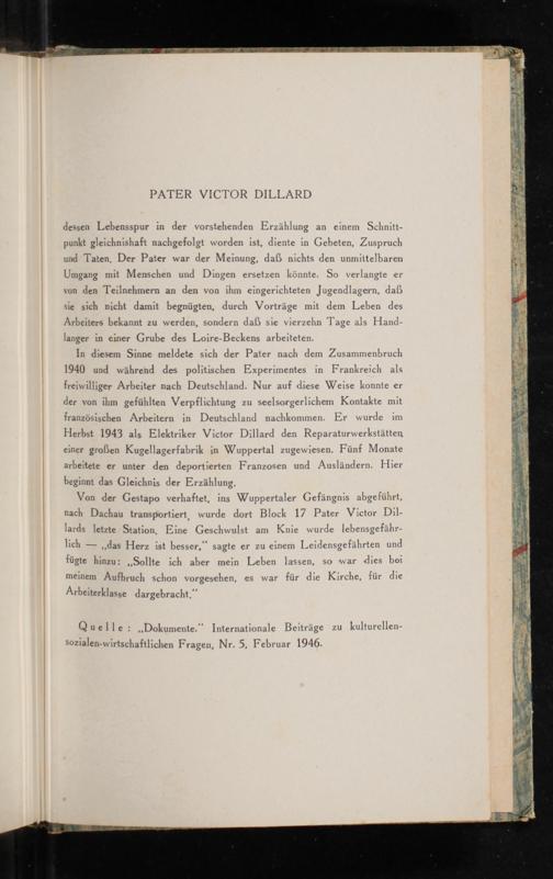 Von der Gestapo verhaftet, ins Wuppertaler Gefängnis abgeführt, nach Dachau transportiert, wurde dort Block 17 Pater Victor Dillards letzte Station, Eine Geschwulst am Knie wurde lebensgefährlich- ,, das Herz ist besser," sagte er zu einem Leidensgefährten und fügte hinzu: ,, Sollte ich aber mein Leben lassen, so war dies bei meinem Aufbruch schon vorgesehen, es war für die Kirche, für die Arbeiterklasse dargebracht."