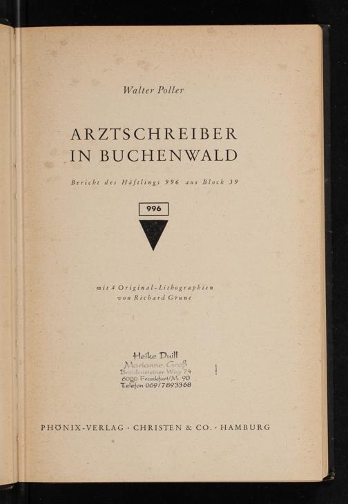 Walter Poller ARZTSCHREIBER IN BUCHENWALD Bericht des Häftlings 996 aus Block 39 996 mit 4 Original- Lithographien von Richard Grune Heike Duill Marianne, Groß Breidensteiner Weg 74 6000 Frankfurt / M. 90 Telefon 069/7893368 PHONIX- VERLAG CHRISTEN& CO. HAMBURG