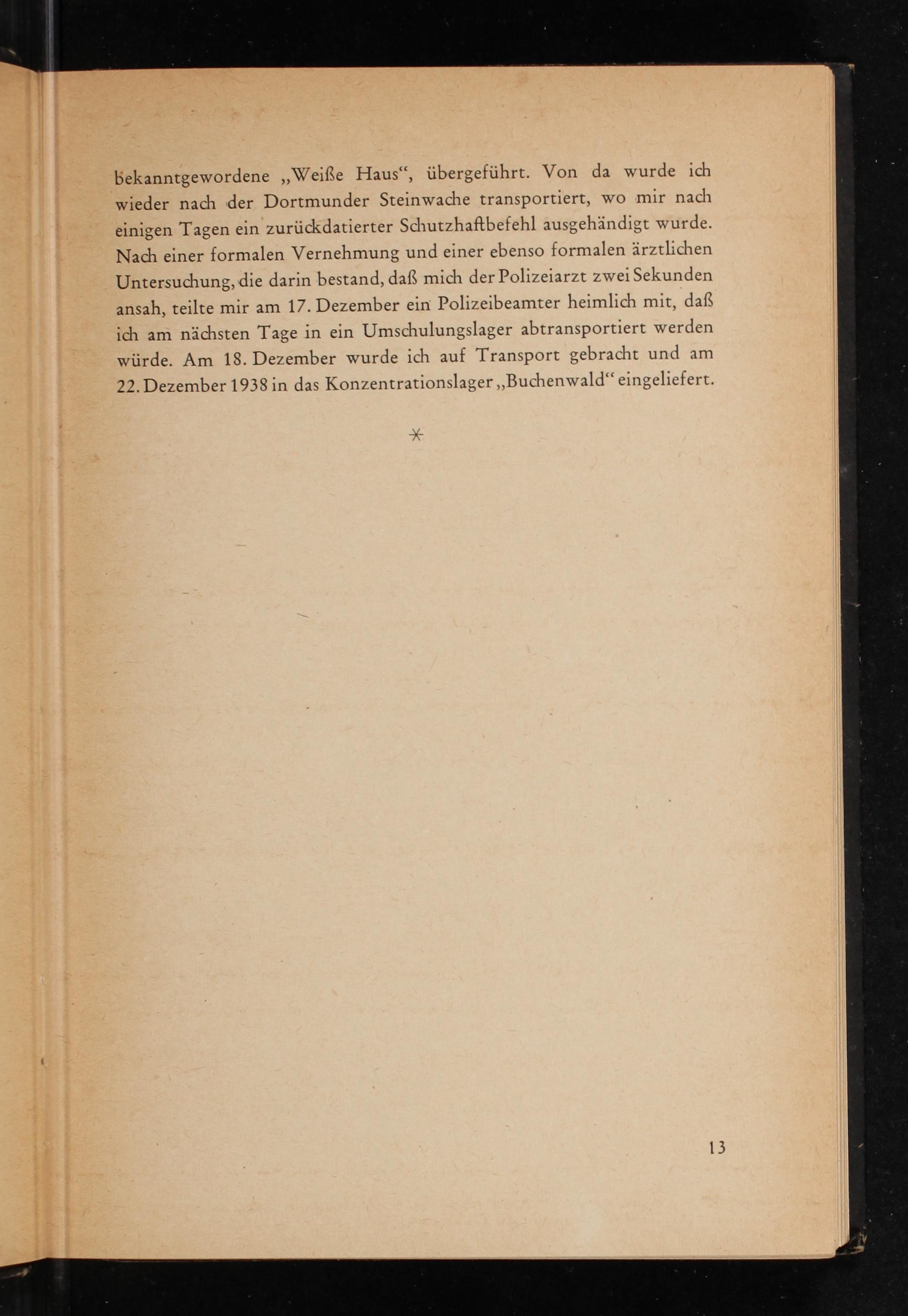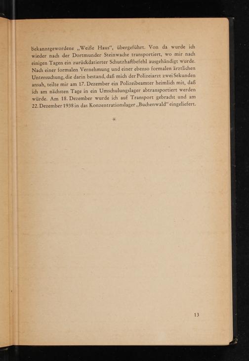 einigen Tagen ein zurückdatierter Schutzhaftbefehl ausgehändigt wurde. Nach einer formalen Vernehmung und einer ebenso formalen ärztlichen Untersuchung, die darin bestand, daß mich der Polizeiarzt zwei Sekunden ansah, teilte mir am 17. Dezember ein Polizeibeamter heimlich mit, daß ich am nächsten Tage in ein Umschulungslager abtransportiert werden würde. Am 18. Dezember wurde ich auf Transport gebracht und am 22. Dezember 1938 in das Konzentrationslager„Buchenwald“ eingeliefert.