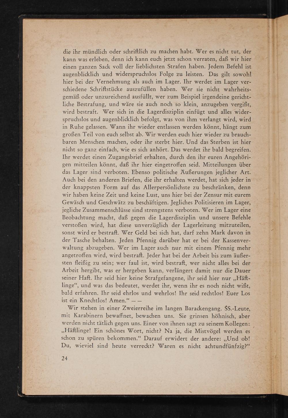 die ihr mündlich oder schriftlich zu machen habt. Wer es nicht tut, der kann was erleben, denn ich kann euch jetzt schon verraten, daß wir hier einen ganzen Sack voll der lieblichsten Strafen haben. Jedem Befehl ist augenblicklich und widerspruchslos Folge zu leisten. Das gilt sowohl hier bei der Vernehmung als auch im Lager. Ihr werdet im Lager ver- schiedene Schriftstücke auszufüllen haben. Wer sie nicht wahrheits- gemäß oder unzureichend ausfüllt, wer zum Beispiel irgendeine gericht- liche Bestrafung, und wäre sie auch noch so klein, anzugeben vergißt, wird bestraft. Wer sich in die Lagerdisziplin einfügt und alles wider- spruchslos und augenblicklich befolgt, was von ihm verlangt wird, wird in Ruhe gelassen. Wann ihr wieder entlassen werden könnt, hängt zum großen Teil von euch selbst ab. Wir werden euch hier wieder zu brauch- baren Menschen machen, oder ihr sterbt hier. Und das Sterben ist hier nicht so ganz einfach, wie es sich anhört. Das werdet ihr bald begreifen. Ihr werdet einen Zugangsbrief erhalten, durch den ihr euren Angehöri- gen mitteilen könnt, daß ihr hier eingetroffen seid. Mitteilungen über das Lager sind verboten. Ebenso politische Äußerungen jeglicher Art. Auch bei den anderen Briefen, die ihr erhalten werdet, hat sich jeder in der knappsten Form auf das Allerpersönlichste zu beschränken, denn wir haben keine Zeit und keine Lust, uns hier bei der Zensur mit eurem Gewäsch und Geschwätz zu beschäftigen. Jegliches Politisieren im Lager, jegliche Zusammenschlüsse sind strengstens verboten. Wer im Lager eine Beobachtung macht, daß gegen die Lagerdisziplin und unsere Befehle verstoßen wird, hat diese unverzüglich der Lagerleitung mitzuteilen, sonst wird er bestraft. Wer Geld bei sich hat, darf zehn Mark davon in der Tasche behalten. Jeden Pfennig darüber hat er bei der Kassenver- waltung abzugeben. Wer im Lager auch nur mit einem Pfennig mehr angetroffen wird, wird bestraft. Jeder hat bei der Arbeit bis zum äußer- sten fleißig zu sein; wer faul ist, wird bestraft, wer nicht alles bei der Arbeit hergibt, was er hergeben kann, verlängert damit nur die Dauer seiner Haft. Ihr seid hier keine Strafgefangene, ihr seid hier nur„Häft- linge“, und was das bedeutet, werdet ihr, wenn ihr es noch nicht wißt, bald erfahren. Ihr seid ehrlos und wehrlos! Ihr seid rechtlos! Euer Los ist ein Knechtlos! Amen.“——