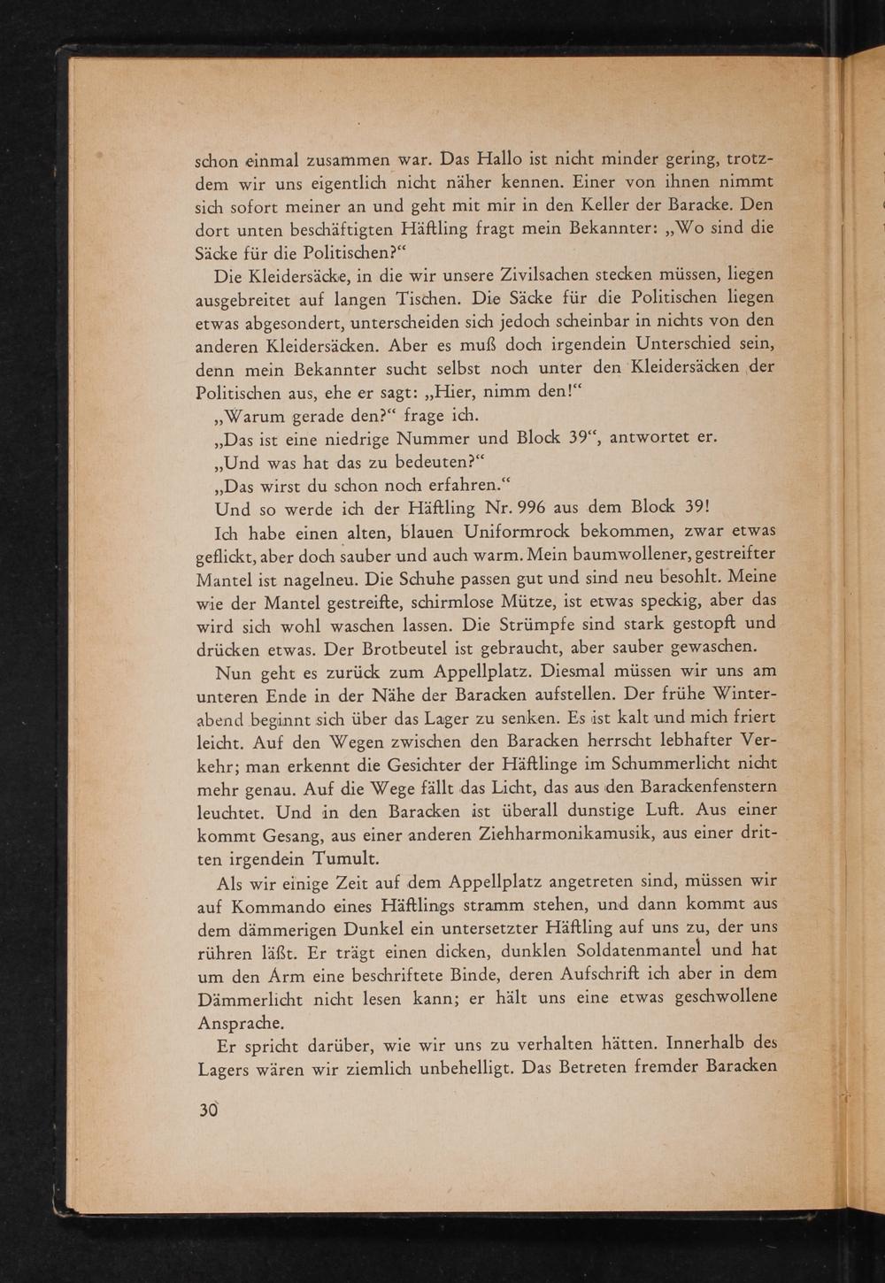 Nun geht es zurück zum Appellplatz. Diesmal müssen wir uns am unteren Ende in der Nähe der Baracken aufstellen. Der frühe Winter- abend beginnt sich über das Lager zu senken. Es ist kalt und mich friert leicht. Auf den Wegen zwischen den Baracken herrscht lebhafter Ver- kehr; man erkennt die Gesichter der Häftlinge im Schummerlicht nicht mehr genau. Auf die Wege fällt das Licht, das aus den Barackenfenstern leuchtet. Und in den Baracken ist überall dunstige Luft. Aus einer kommt Gesang, aus einer anderen Ziehharmonikamusik, aus einer drit- ten irgendein Tumult.