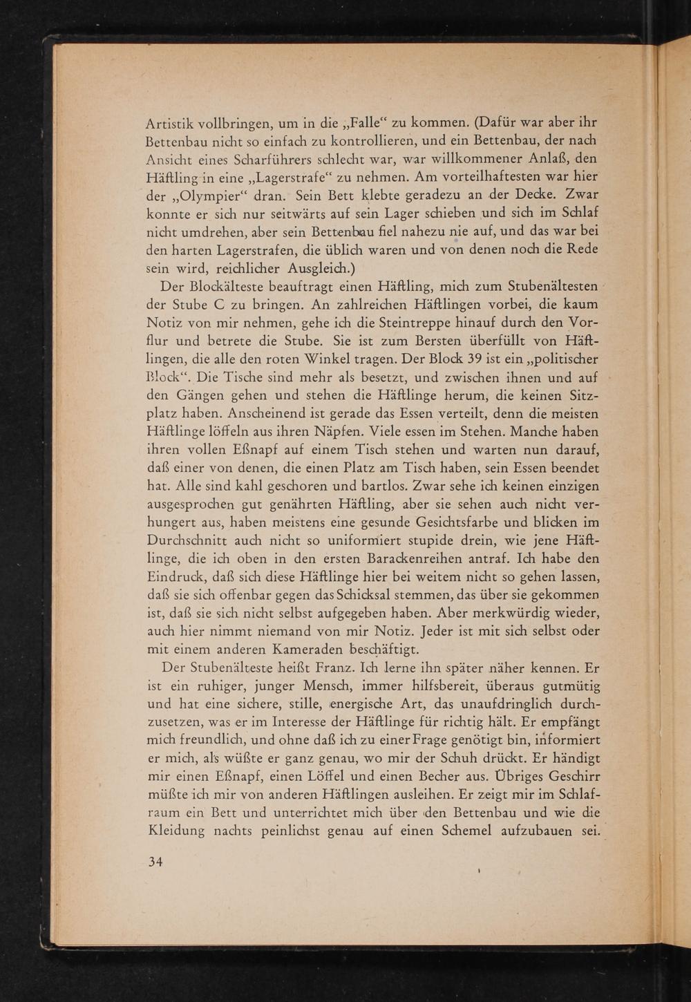 Der Stubenälteste heißt Franz. Ich lerne ihn später näher kennen. Er ist ein ruhiger, junger Mensch, immer hilfsbereit, überaus gutmütig und hat eine sichere, stille, energische Art, das unaufdringlich durchzusetzen, was er im Interesse der Häftlinge für richtig hält. Er empfängt mich freundlich, und ohne daß ich zu einer Frage genötigt bin, informiert er mich, als wüßte er ganz genau, wo mir der Schuh drückt. Er händigt mir einen Eẞnapf, einen Löffel und einen Becher aus. Übriges Geschirr müßte ich mir von anderen Häftlingen ausleihen. Er zeigt mir im Schlafraum ein Bett und unterrichtet mich über den Bettenbau und wie die Kleidung nachts peinlichst genau auf einen Schemel aufzubauen sei.