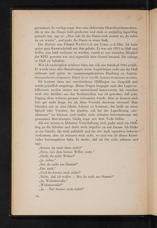 Der Barbier war Eduard Raderick aus Cranz a.d. Elbe. Ich habe später gute Kameradschaft mit ihm gehabt. Er war seit 1933 in Haft und hoffte, nun bald entlassen zu werden, zumal er nur einfaches Mitglied der KPD. gewesen war und eigentlich kein Grund bestand, ihn solange in Haft zu behalten.