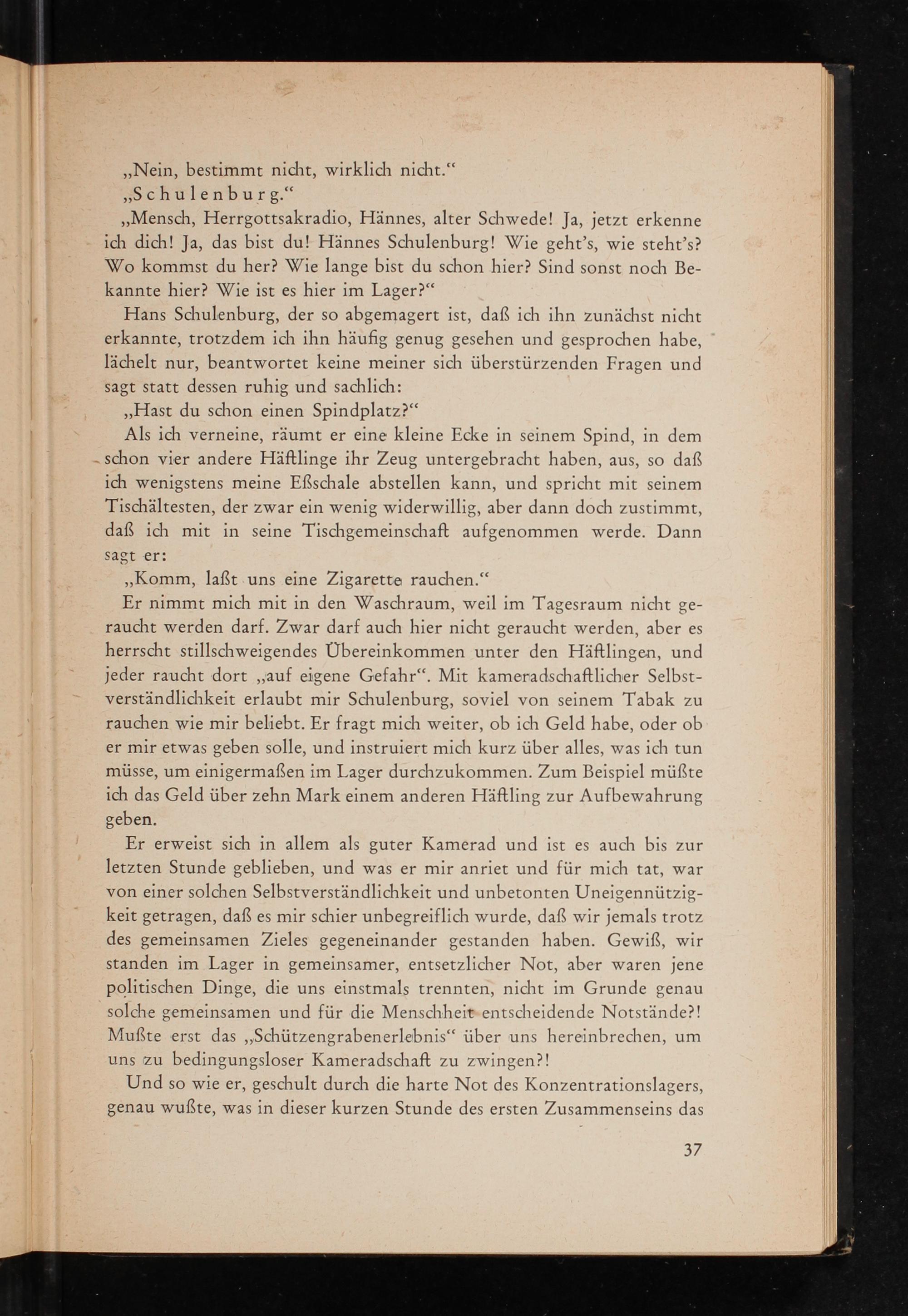 Er nimmt mich mit in den Waschraum, weil im Tagesraum nicht geraucht werden darf. Zwar darf auch hier nicht geraucht werden, aber es herrscht stillschweigendes Übereinkommen unter den Häftlingen, und jeder raucht dort ,, auf eigene Gefahr". Mit kameradschaftlicher Selbstverständlichkeit erlaubt mir Schulenburg, soviel von seinem Tabak zu rauchen wie mir beliebt. Er fragt mich weiter, ob ich Geld habe, oder ob er mir etwas geben solle, und instruiert mich kurz über alles, was ich tun müsse, um einigermaßen im Lager durchzukommen. Zum Beispiel müßte ich das Geld über zehn Mark einem anderen Häftling zur Aufbewahrung geben.