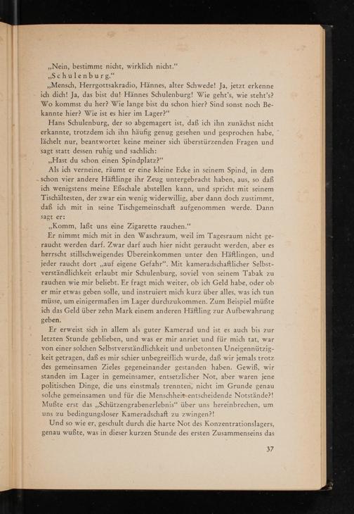 Er erweist sich in allem als guter Kamerad und ist es auch bis zur letzten Stunde geblieben, und was er mir anriet und für mich tat, war von einer solchen Selbstverständlichkeit und unbetonten Uneigennützigkeit getragen, daß es mir schier unbegreiflich wurde, daß wir jemals trotz des gemeinsamen Zieles gegeneinander gestanden haben. Gewiß, wir standen im Lager in gemeinsamer, entsetzlicher Not, aber waren jene politischen Dinge, die uns einstmals trennten, nicht im Grunde genau solche gemeinsamen und für die Menschheit entscheidende Notstände?! Mußte erst das ,, Schützengrabenerlebnis" über uns hereinbrechen, um uns zu bedingungsloser Kameradschaft zu zwingen?!