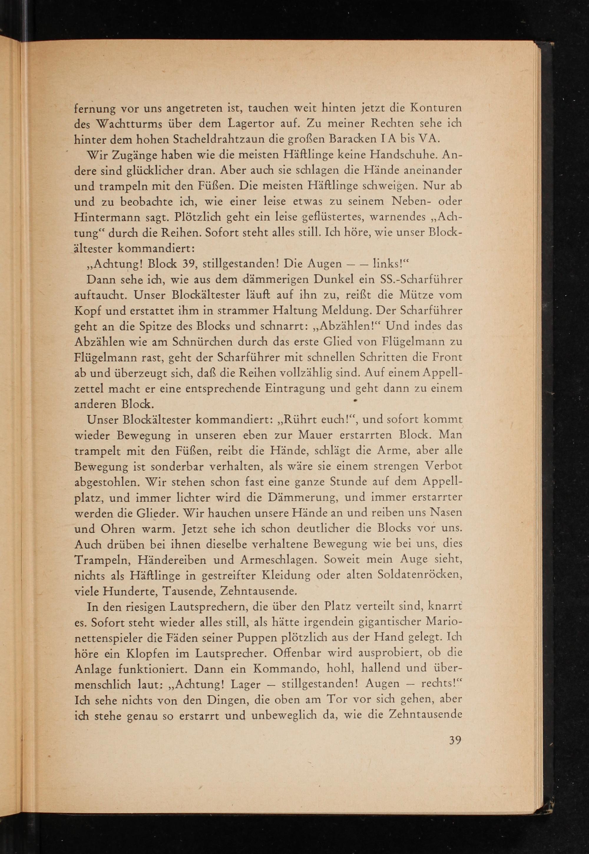 Unser Blockältester kommandiert: ,, Rührt euch!", und sofort kommt wieder Bewegung in unseren eben zur Mauer erstarrten Block. Man trampelt mit den Füßen, reibt die Hände, schlägt die Arme, aber alle Bewegung ist sonderbar verhalten, als wäre sie einem strengen Verbot abgestohlen. Wir stehen schon fast eine ganze Stunde auf dem Appellplatz, und immer lichter wird die Dämmerung, und immer erstarrter werden die Glieder. Wir hauchen unsere Hände an und reiben uns Nasen und Ohren warm. Jetzt sehe ich schon deutlicher die Blocks vor uns. Auch drüben bei ihnen dieselbe verhaltene Bewegung wie bei uns, dies Trampeln, Händereiben und Armeschlagen. Soweit mein Auge sieht, nichts als Häftlinge in gestreifter Kleidung oder alten Soldatenröcken, viele Hunderte, Tausende, Zehntausende.