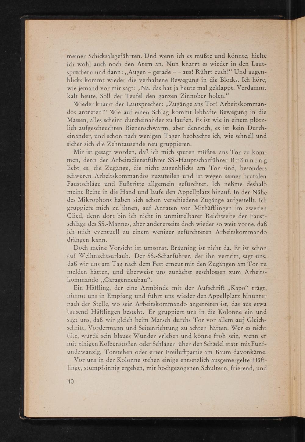 Ein Häftling, der eine Armbinde mit der Aufschrift ,, Kapo " trägt, nimmt uns in Empfang und führt uns wieder den Appellplatz hinunter nach der Stelle, wo sein Arbeitskommando angetreten ist, das aus etwa tausend Häftlingen besteht. Er gruppiert uns in die Kolonne ein und sagt uns, daß wir gleich beim Marsch durchs Tor vor allem auf Gleichschritt, Vordermann und Seitenrichtung zu achten hätten. Wer es nicht täte, würde sein blaues Wunder erleben und könne froh sein, wenn er mit einigen Kolbenstößen oder Schlägen über den Schädel statt mit Fünfundzwanzig, Torstehen oder einer Freiluftpartie am Baum davonkäme.