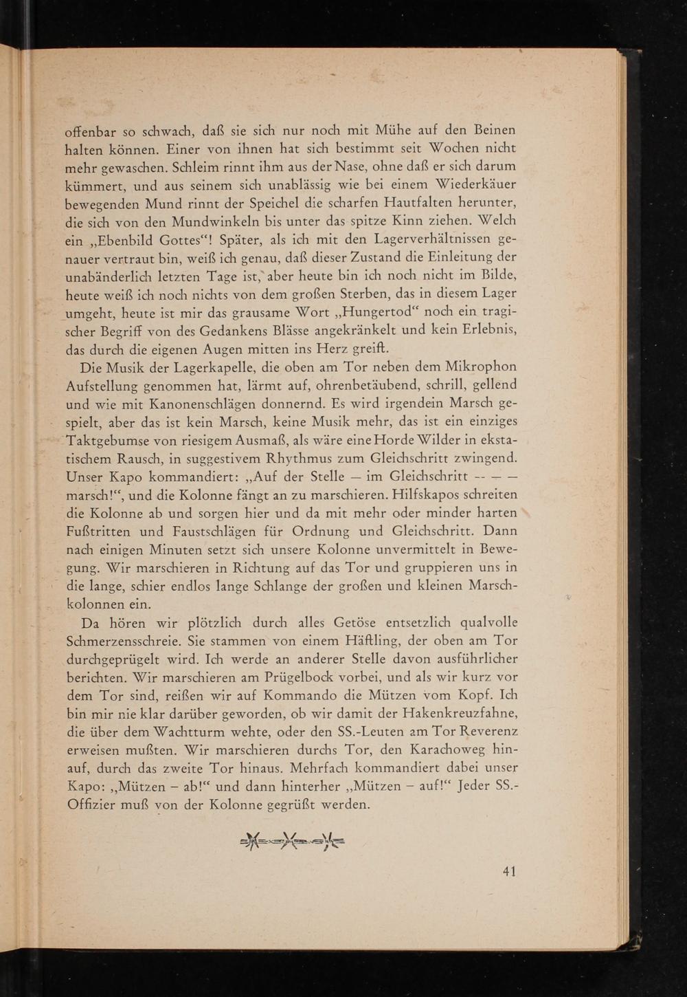 Die Musik der Lagerkapelle, die oben am Tor neben dem Mikrophon Aufstellung genommen hat, lärmt auf, ohrenbetäubend, schrill, gellend und wie mit Kanonenschlägen donnernd. Es wird irgendein Marsch gespielt, aber das ist kein Marsch, keine Musik mehr, das ist ein einziges Taktgebumse von riesigem Ausmaß, als wäre eine Horde Wilder in ekstatischem Rausch, in suggestivem Rhythmus zum Gleichschritt zwingend. Unser Kapo kommandiert: ,, Auf der Stelle im Gleichschritt--marsch!", und die Kolonne fängt an zu marschieren. Hilfskapos schreiten die Kolonne ab und sorgen hier und da mit mehr oder minder harten Fuẞtritten und Faustschlägen für Ordnung und Gleichschritt. Dann nach einigen Minuten setzt sich unsere Kolonne unvermittelt in Bewegung. Wir marschieren in Richtung auf das Tor und gruppieren uns in die lange, schier endlos lange Schlange der großen und kleinen Marschkolonnen ein.