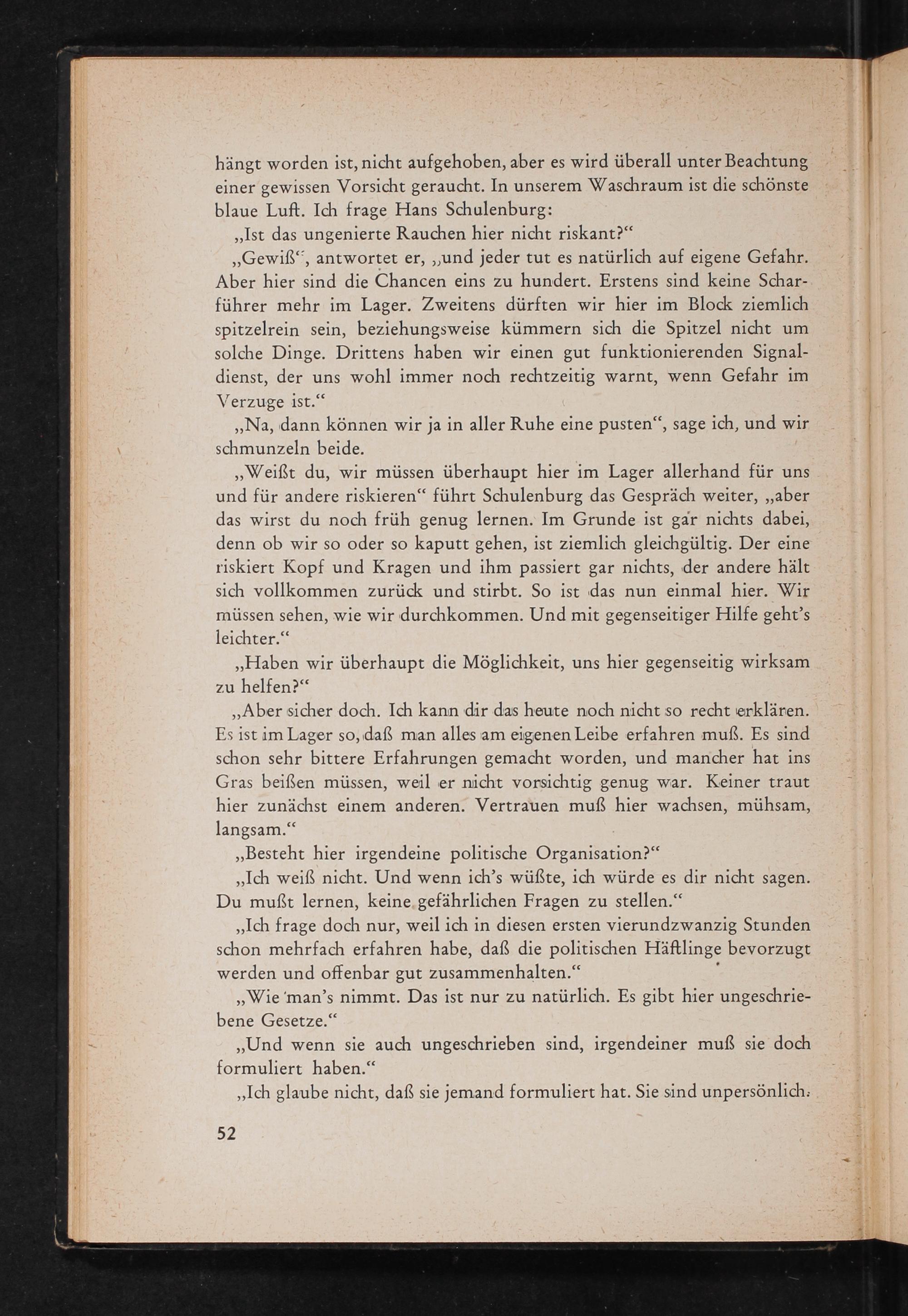 „Weißt du, wir müssen überhaupt hier im Lager allerhand für uns und für andere riskieren“ führt Schulenburg das Gespräch weiter,„aber das wirst du noch früh genug lernen. Im Grunde ist gar nichts dabei, denn ob wir so oder so kaputt gehen, ist ziemlich gleichgültig. Der eine riskiert Kopf und Kragen und ihm passiert gar nichts, der andere hält sich vollkommen zurück und stirbt. So ist das nun einmal hier. Wir müssen sehen, wie wir durchkommen. Und mit gegenseitiger Hilfe geht’s leichter.“