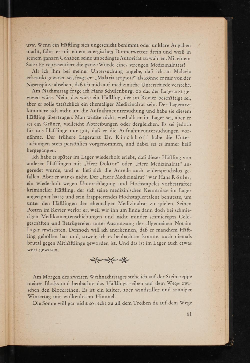 Ich habe es später im Lager wiederholt erlebt, daß dieser Häftling von anderen Häftlingen mit ,, Herr Doktor" oder„, Herr Medizinalrat" angeredet wurde, und er ließ sich die Anrede auch widerspruchslos gefallen. Aber er war es nicht. Der ,, Herr Medizinalrat" war Hans Rösler, ein wiederholt wegen Unterschlagung und Hochstapelei vorbestrafter krimineller Häftling, der sich seine medizinischen Kenntnisse im Lager angeeignet hatte und sein frappierendes Hochstaplertalent benutzte, um unter den Häftlingen den ehemaligen Medizinalrat zu spielen. Seinen Posten im Revier verlor er, weil wir ihn am Ende dann doch bei schmierigen Medikamentenschiebungen und nicht minder schmierigen Geldgeschäften und Betrügereien unter Ausnutzung der allgemeinen Not im Lager erwischten. Dennoch will ich anerkennen, daß er manchem Häftling geholfen hat und, soweit ich es beobachten konnte, auch niemals brutal gegen Mithäftlinge geworden ist. Und das ist im Lager auch etwas
