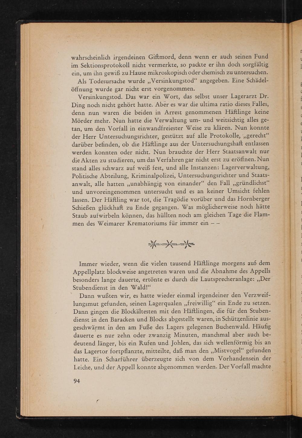 Versinkungstod. Das war ein Wort, das selbst unser Lagerarzt Dr. Ding noch nicht gehört hatte. Aber es war die ultima ratio dieses Falles, denn nun waren die beiden in Arrest genommenen Häftlinge keine Mörder mehr. Nun hatte die Verwaltung um- und weitsichtig alles getan, um den Vorfall in einwandfreiester Weise zu klären. Nun konnte der Herr Untersuchungsrichter, gestützt auf alle Protokolle ,,, gerecht" darüber befinden, ob die Häftlinge aus der Untersuchungshaft entlassen werden konnten oder nicht. Nun brauchte der Herr Staatsanwalt nur die Akten zu studieren, um das Verfahren gar nicht erst zu eröffnen. Nun stand alles schwarz auf weiß fest, und alle Instanzen: Lagerverwaltung, Politische Abteilung, Kriminalpolizei, Untersuchungsrichter und Staatsanwalt, alle hatten ,, unabhängig von einander" den Fall„ gründlichst" und unvoreingenommen untersucht und es an keiner Umsicht fehlen lassen. Der Häftling war tot, die Tragödie vorüber und das Hornberger Schießen glückhaft zu Ende gegangen. Was möglicherweise noch hätte Staub aufwirbeln können, das hüllten noch am gleichen Tage die Flammen des Weimarer Krematoriums für immer ein-