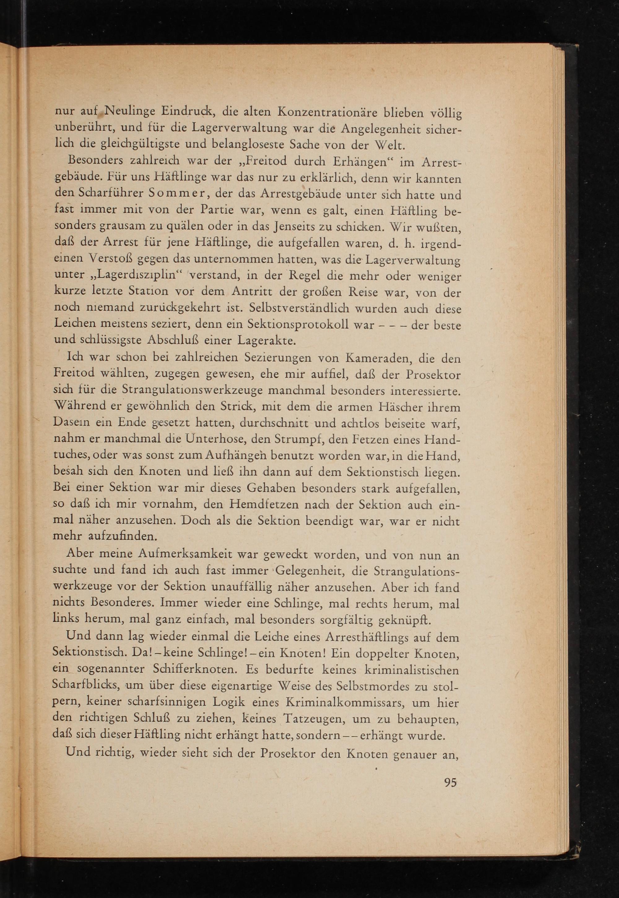 Besonders zahlreich war der ,, Freitod durch Erhängen" im Arrestgebäude. Für uns Häftlinge war das nur zu erklärlich, denn wir kannten den Scharführer Sommer, der das Arrestgebäude unter sich hatte und fast immer mit von der Partie war, wenn es galt, einen Häftling besonders grausam zu quälen oder in das Jenseits zu schicken. Wir wußten, daß der Arrest für jene Häftlinge, die aufgefallen waren, d. h. irgendeinen Verstoß gegen das unternommen hatten, was die Lagerverwaltung unter ,, Lagerdisziplin" verstand, in der Regel die mehr oder weniger kurze letzte Station vor dem Antritt der großen Reise war, von der noch niemand zurückgekehrt ist. Selbstverständlich wurden auch diese Leichen meistens seziert, denn ein Sektionsprotokoll war--- der beste und schlüssigste Abschluß einer Lagerakte.