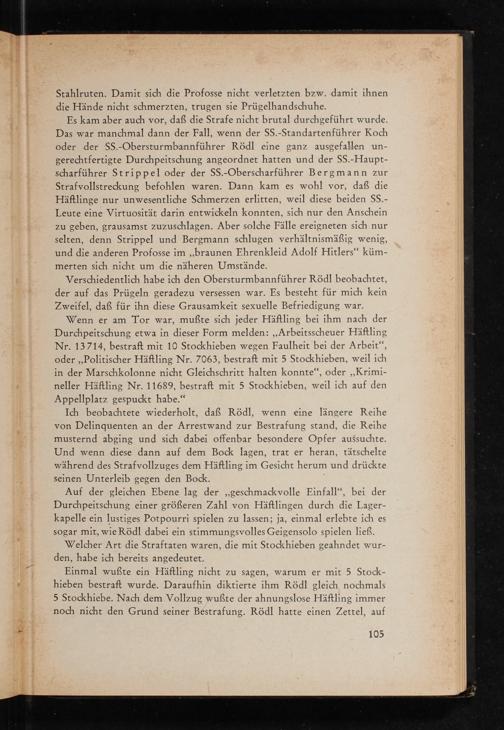 Es kam aber auch vor, daß die Strafe nicht brutal durchgeführt wurde. Das war manchmal dann der Fall, wenn der SS.- Standartenführer Koch oder der SS.- Obersturmbannführer Rödl eine ganz ausgefallen ungerechtfertigte Durchpeitschung angeordnet hatten und der SS. - Hauptscharführer Strippel oder der SS. - Oberscharführer Bergmann zur Strafvollstreckung befohlen waren. Dann kam es wohl vor, daß die Häftlinge nur unwesentliche Schmerzen erlitten, weil diese beiden SS. Leute eine Virtuosität darin entwickeln konnten, sich nur den Anschein zu geben, grausamst zuzuschlagen. Aber solche Fälle ereigneten sich nur selten, denn Strippel und Bergmann schlugen verhältnismäßig wenig, und die anderen Profosse im ,, braunen Ehrenkleid Adolf Hitlers " kümmerten sich nicht um die näheren Umstände.